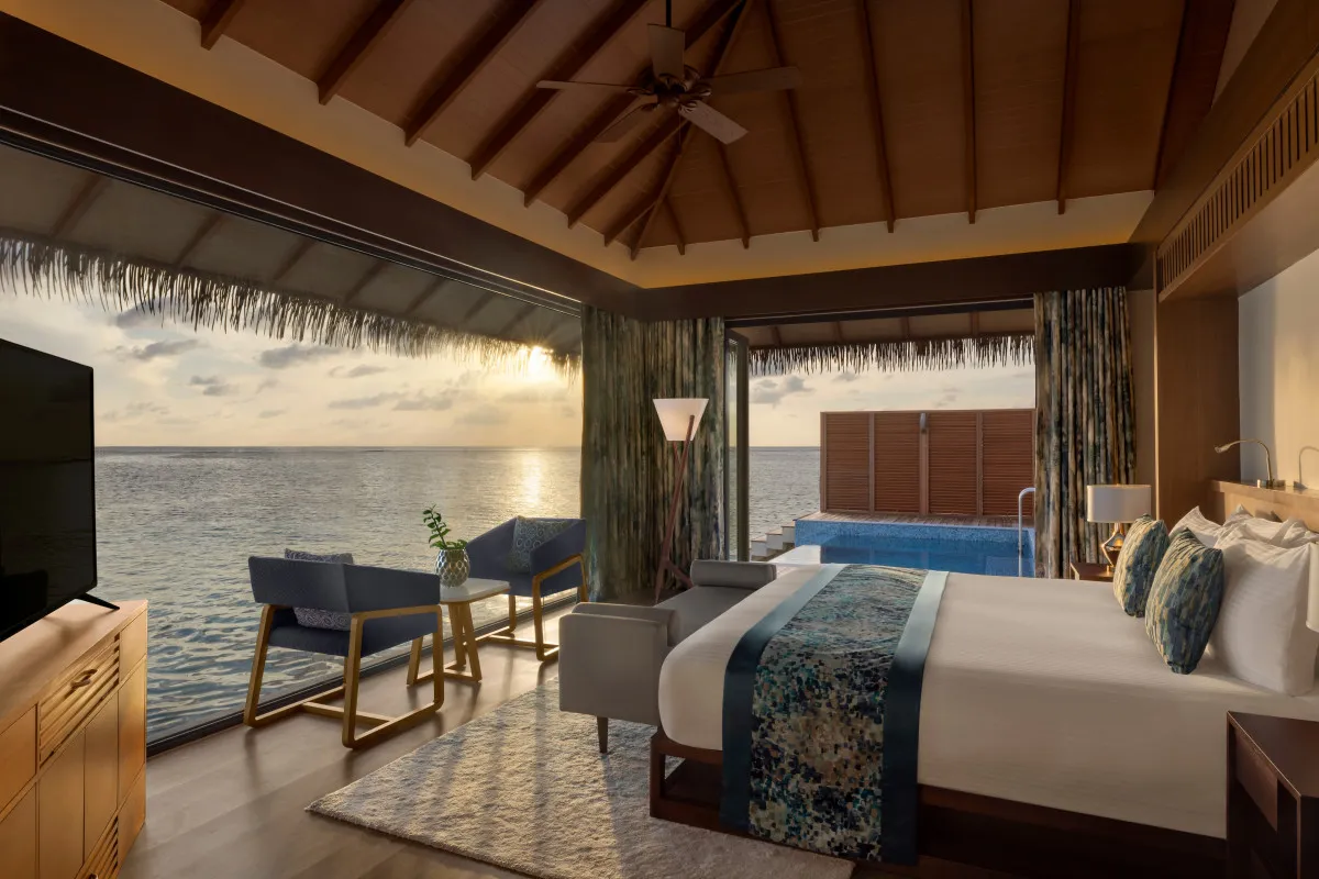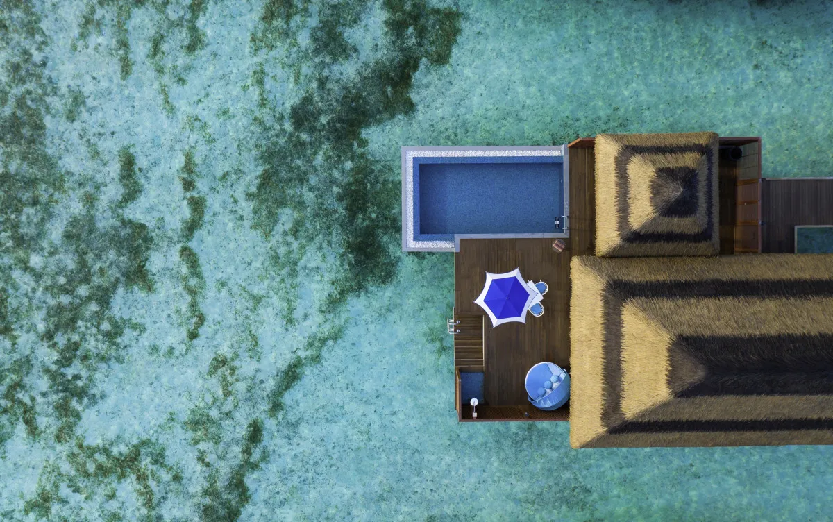 200 м2, вилла с двумя спальнями: под водой с панорамным видом на риф и над океаном с видом на рассвет. Бассейн и две кровати king-size. Максимальное количество гостей: 4.