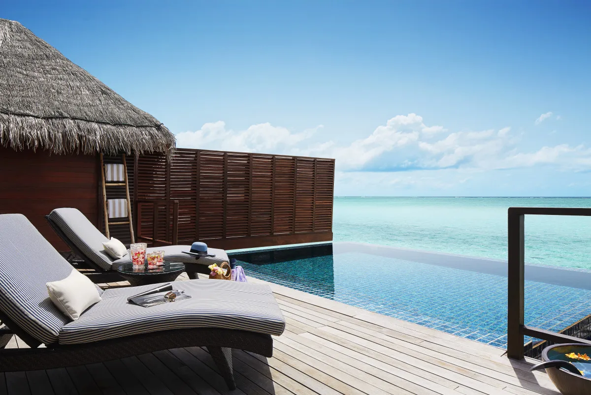 94 м2, вилла над водой с собственным бассейном с пресной водой. Спальня с кроватью king-size, ванная комната с ванной и душевой кабиной, терраса с шезлонгами и спуском в лагуну. Максимальное количество гостей: 4.