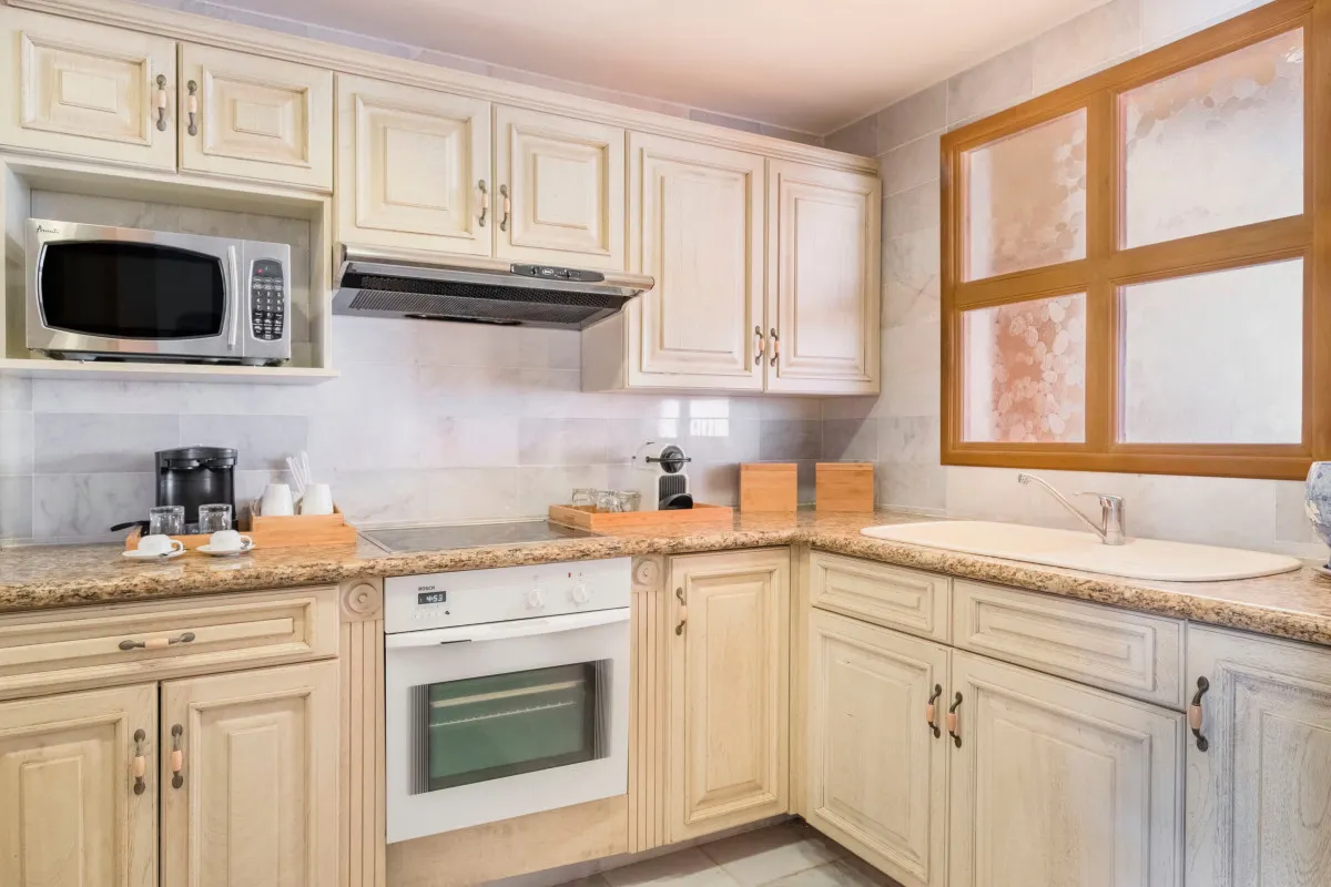 90 м2, две спальни, двуспальная кровать размера «king-size», две односпальные кровати, детские принадлежности, два балкона или террасы с видом на сады