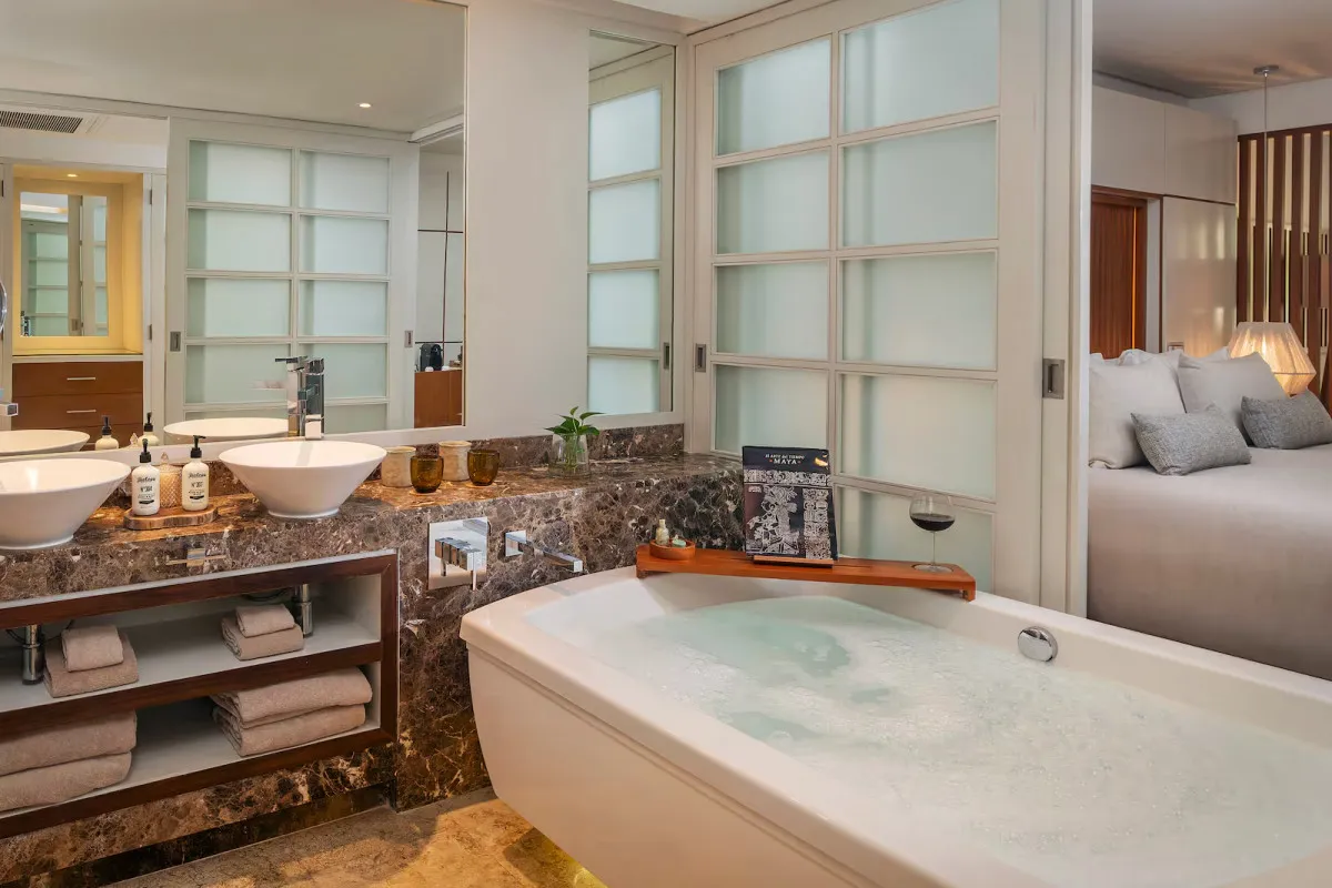 106 м2, терраса (18 кв.м.) с джакузи и выходом к бассейну, вид на бассейн, королевская двуспальная кровать, гостиная-столовая. Эксклюзивные привилегии The Reserve