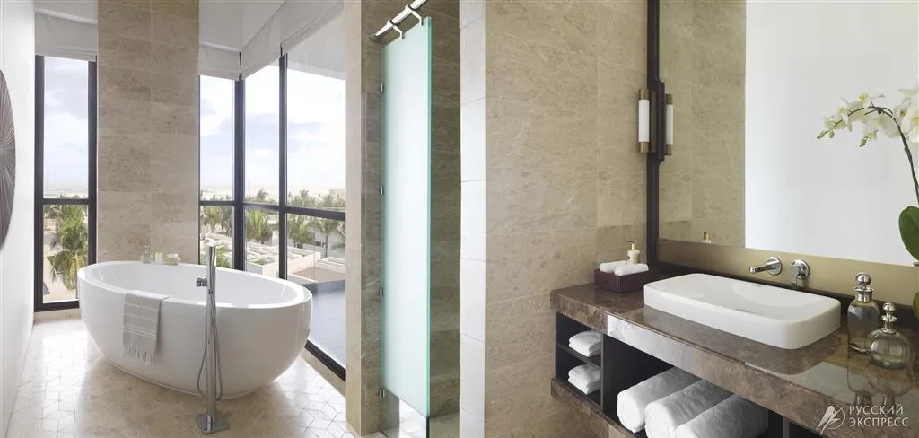 Архитектура курорта вдохновлена прибрежными крепостями Омана: величественные фасады и просторные сады с пальмами, водными каналами и уютными дорожками создают атмосферу уединенного оазиса. Гости могут прогуливаться по тенистым аллеям и наслаждаться видами на лагуну и сады, а также отдыхать у инфинити-бассейна или на белоснежном пляже.
