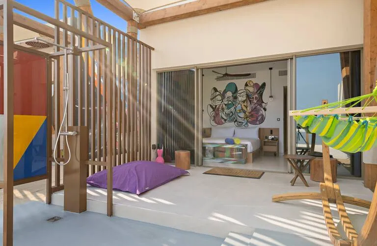 36 м2, терраса с видом на море, одна большая двуспальная кровать. Количество гостей: до 2