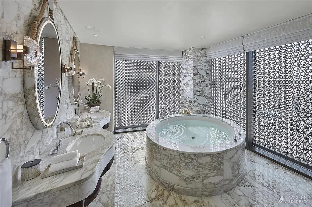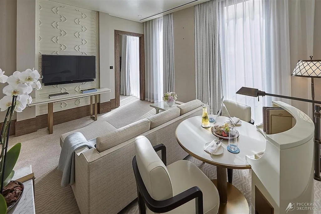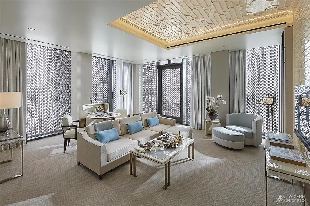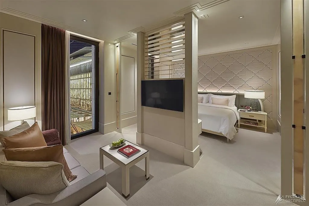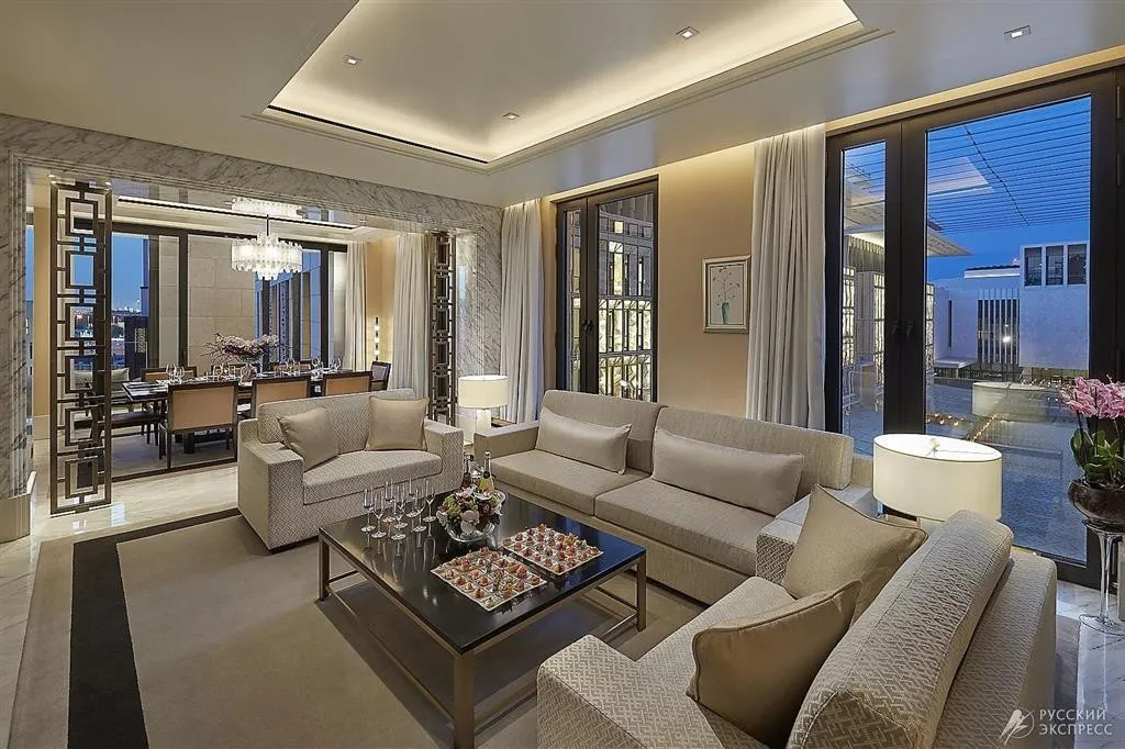98 м2, номер на одном из верхних этажей отеля с видом на город, набережную и район Вест-Бэй, гостиной и одной кроватью king-size.