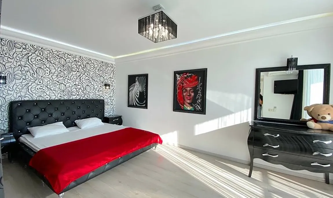 90 м2, с видом на море, спальня с двуспальной кроватью, гостиная, кухня, два раскладных дивана, балкон с мебелью. 9 этаж. Количество гостей: 6
