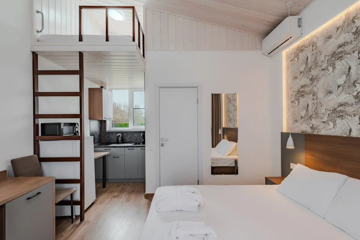 18 м2, двуспальная кровать. В качестве дополнительного места можно использовать кровать на антресоли. Количество гостей: 2