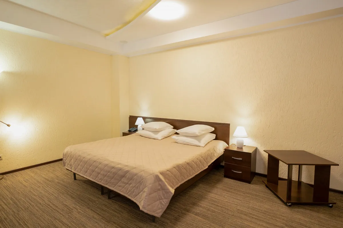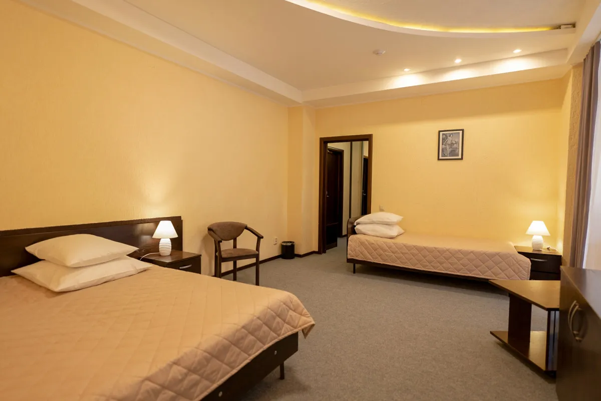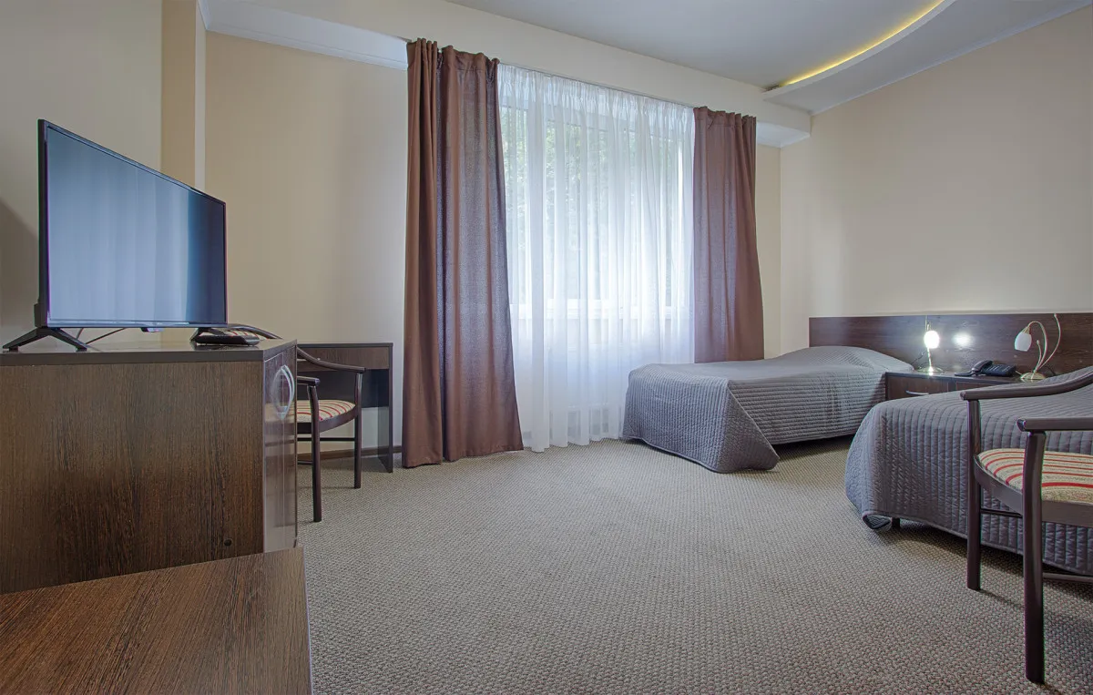 18-21 м2, две односпальные или двуспальная кровать. Дополнительное место – раскладушка или диван. Количество гостей: 2 + 1