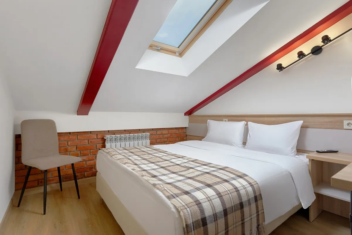 17 м2, двуспальная кровать и односпальная кровать. Номер на 3-м этаже с мансардным окном. Количество гостей: 3