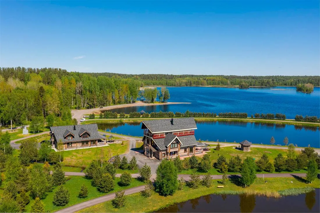 12-местный коттедж делюкс «Карельская изба» площадь 300 кв. м, размещение до 15 гостей. В коттедже 2 этажа, 6 спален с двуспальной кроватью и двумя односпальными кроватями и с собственными ванными комнатами с душем, гостиная с диваном и камином, полностью оснащенная кухня, меблированная терраса, зона для барбекю. Вид на лес и озеро. Возможность размещения до трех дополнительных спальных мест.