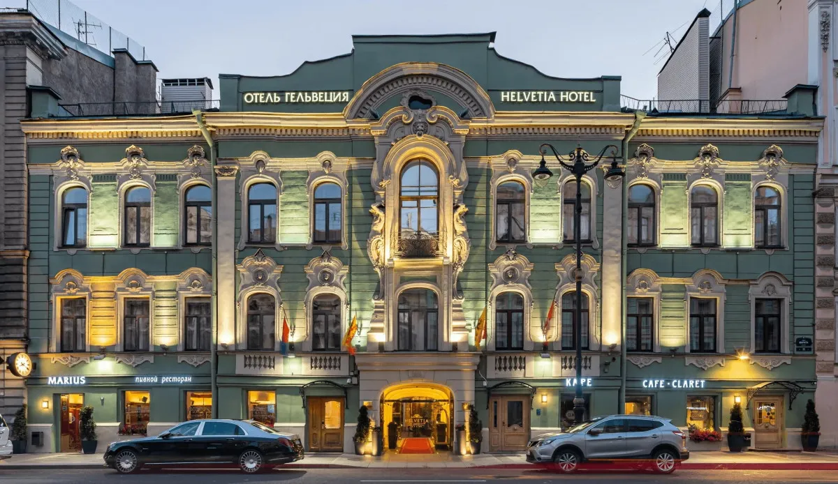 Расположенный в самом центре Санкт-Петербурга, пятизвездочный отель «Гельвеция» создан в традициях европейских династических домов. Особняк XIX века, в котором размещается отель, признан объектом архитектурного наследия и находится под государственной охраной. Элегантный фасад здания украшен фигурами атлантов, подчёркивая его историческое и художественное значение.