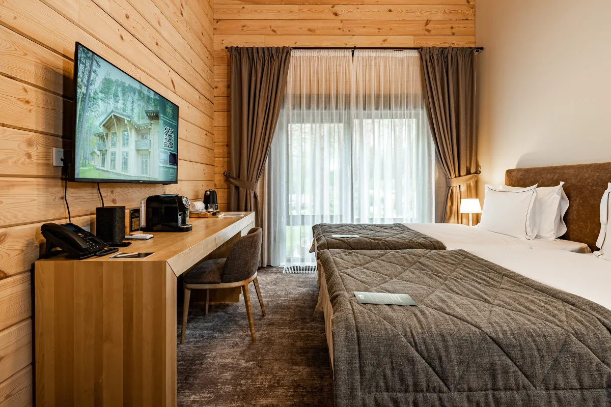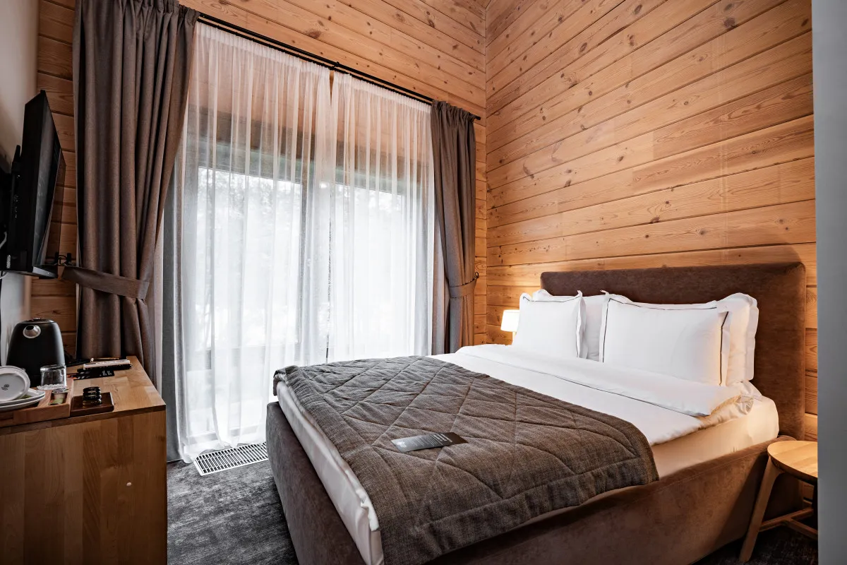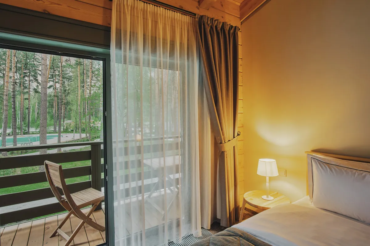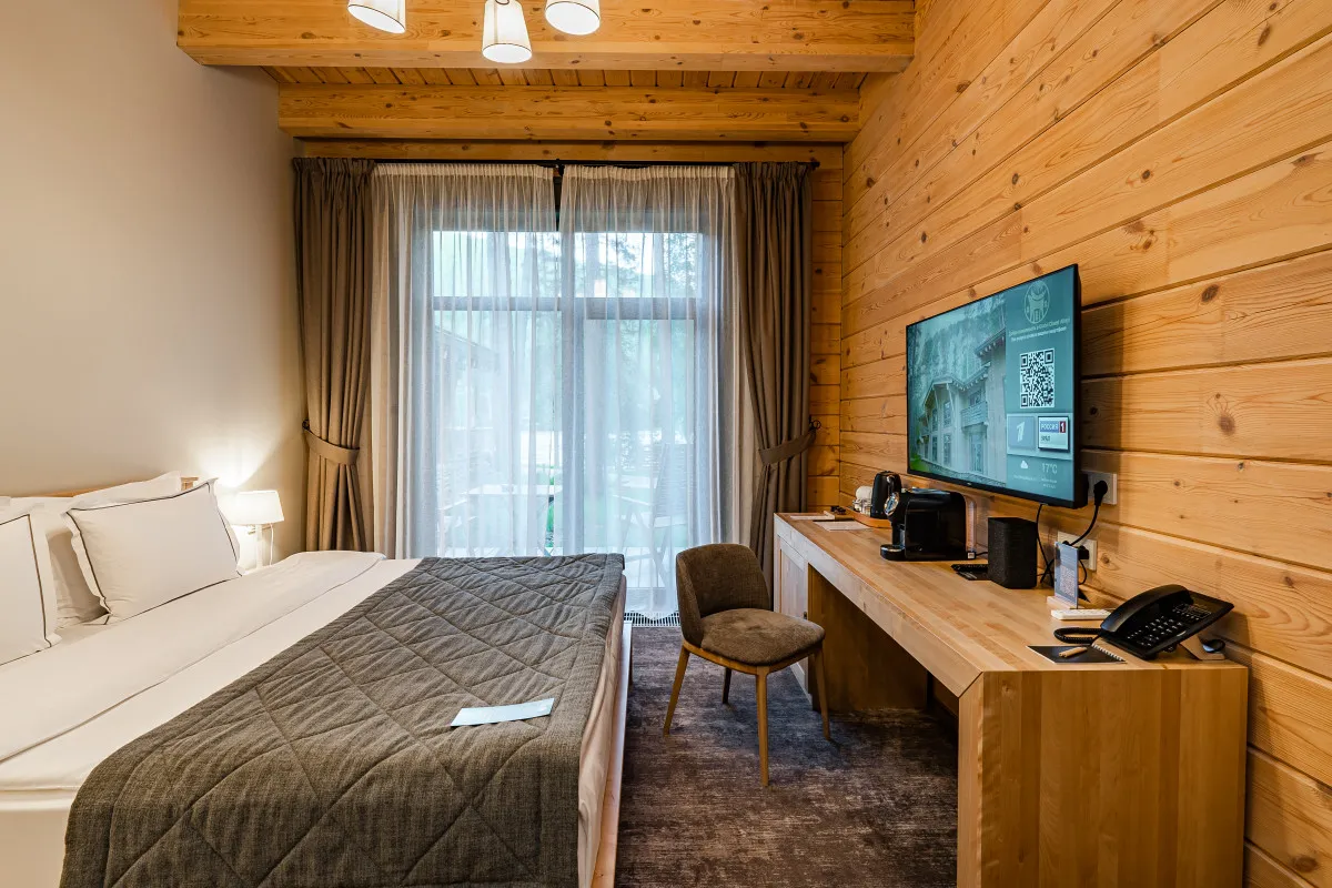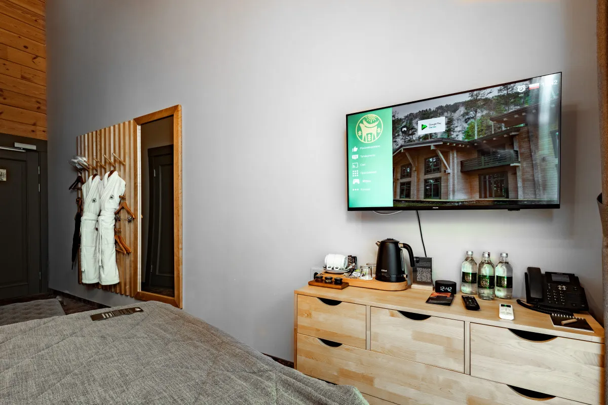 Проживание предусмотрено в стильных номерах отеля или в комфортабельных шале из алтайского кедра, расположенных на территории курорта так, чтобы гости в полной мере ощутили уединенность. Авторский интерьер продуман до мельчайших деталей и подарит незабываемые впечатления изысканного отдыха, а панорамные окна и террасы откроют уникальные виды на Катунь и живописные отвесные скалы.