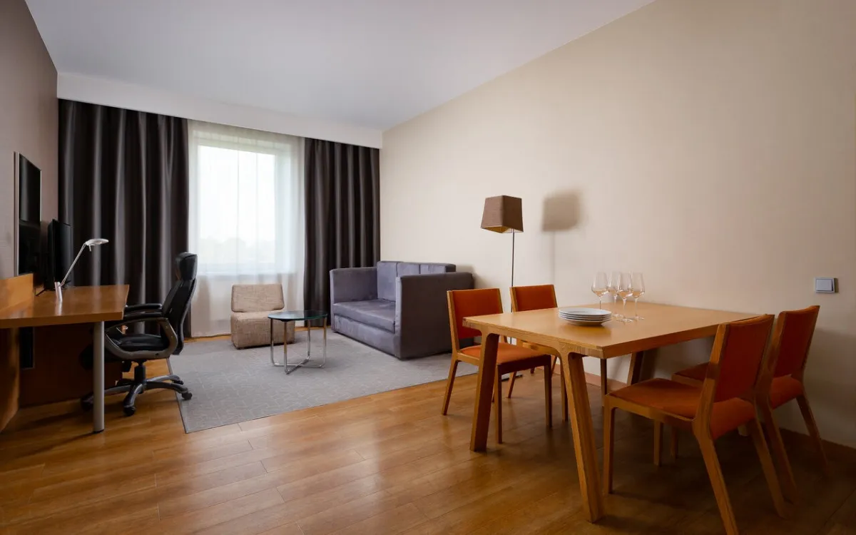 люкс состоит из гостиной и спальни, мини-кухни и раскладного дивана. Количество гостей: до трех человек