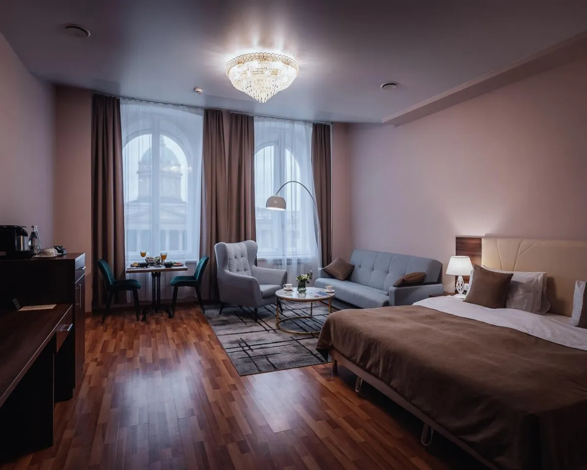 50 м2, фронтальный вид на Казанский собор, просторный номер с панорамными окнами и кроватью размером king-size или двумя односпальными кроватями. Количество гостей: подходит для семейного проживания