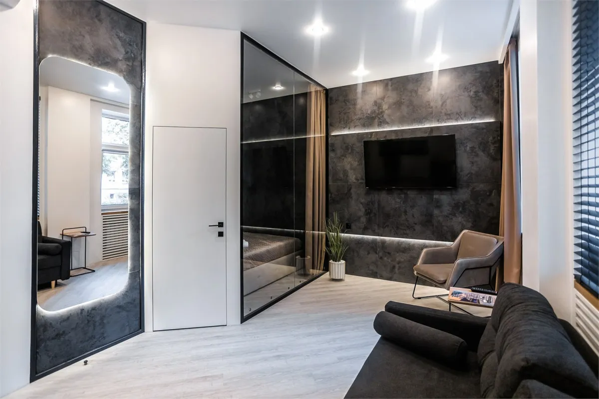 46 м2, вид на город, двуспальная кровать, раскладной диван, гардеробная, кухонная зона, ванная комната с душевой кабиной. Количество гостей: 2 + 2