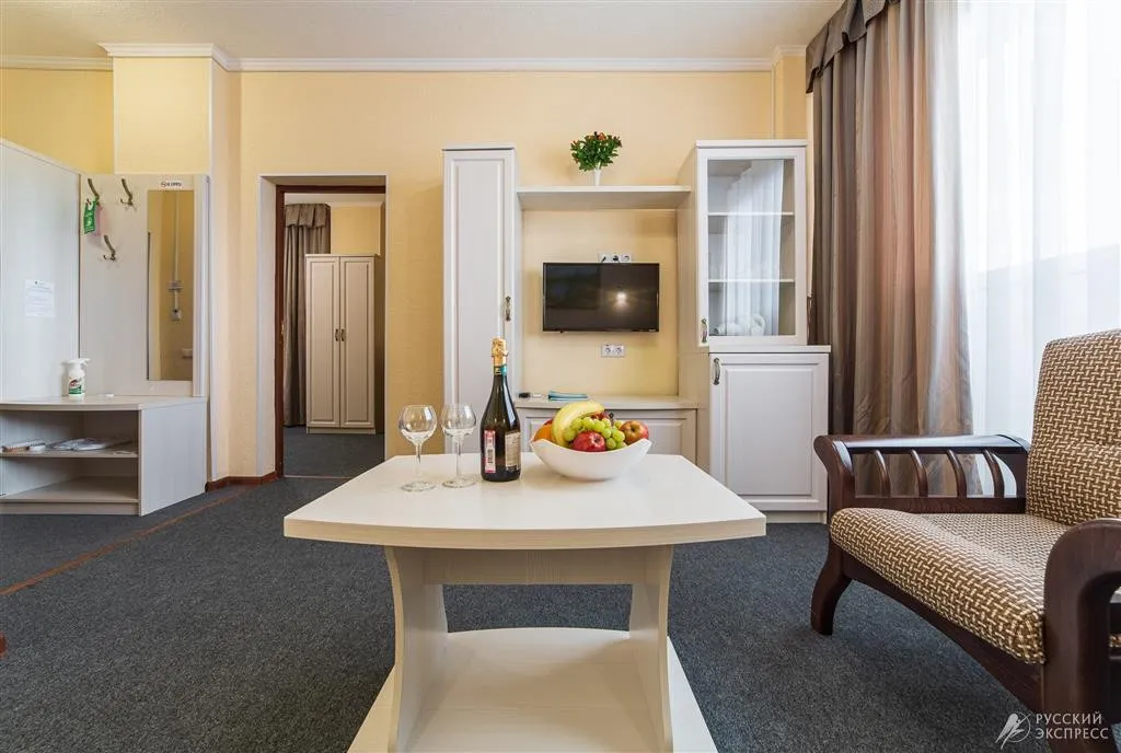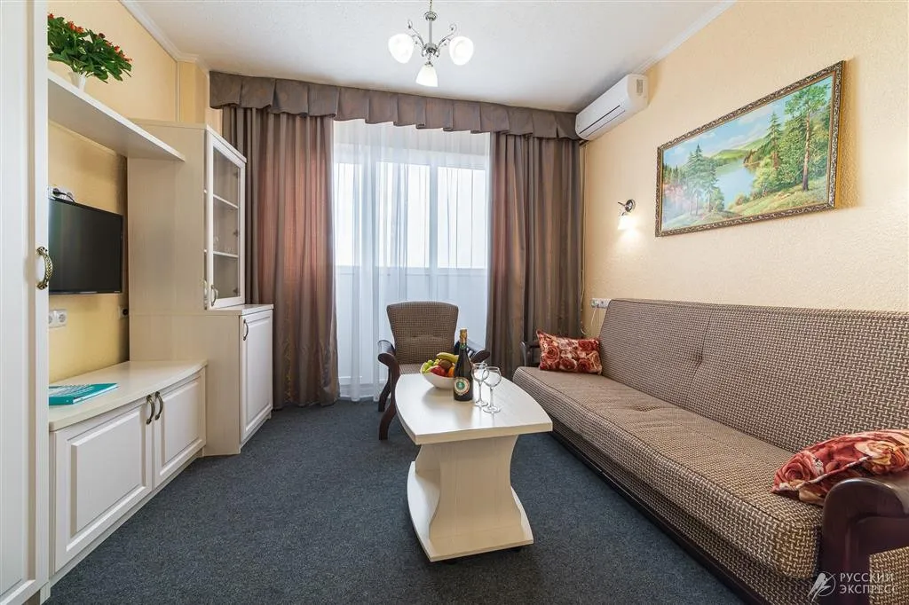 55 м2, номер повышенной комфортности, состоящий из спальной комнаты, гостиной и ванной комнаты. Количество гостей: 4 человека, что удобно для семей с детьми