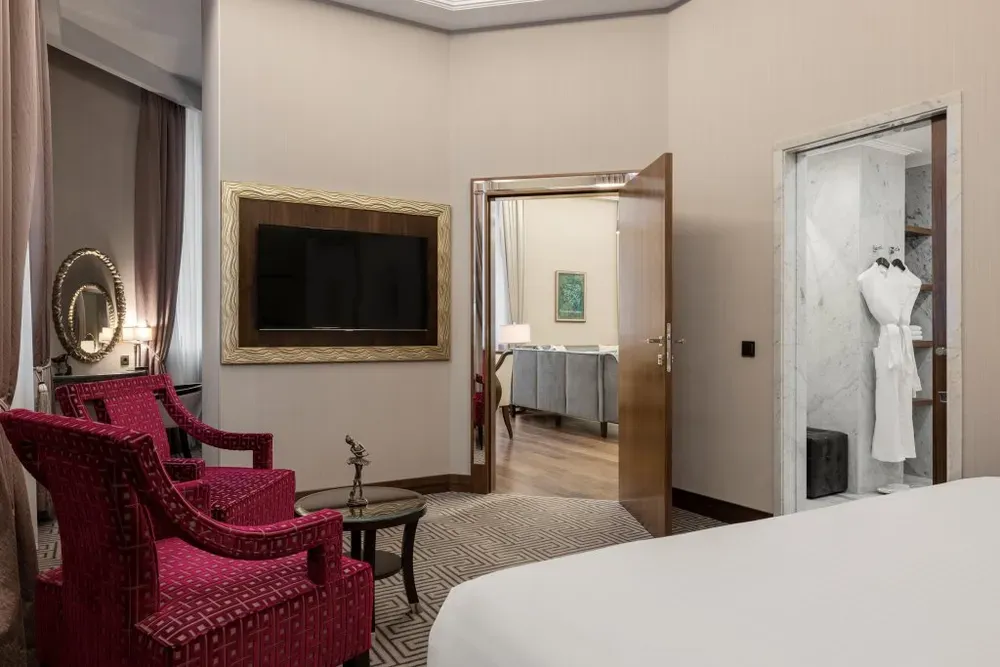 112 м2, композиторский люкс с эксклюзивным оформлением, в отделке использованы натуральные материалы; одна большая двуспальная кровать. Дополнительные удобства: доступ в представительский лаундж.