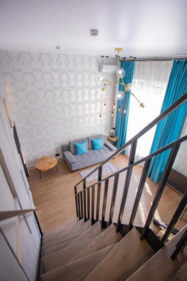 40 м2, двухэтажные апартаменты, двуспальные кровати, гостиная с диваном, кухня