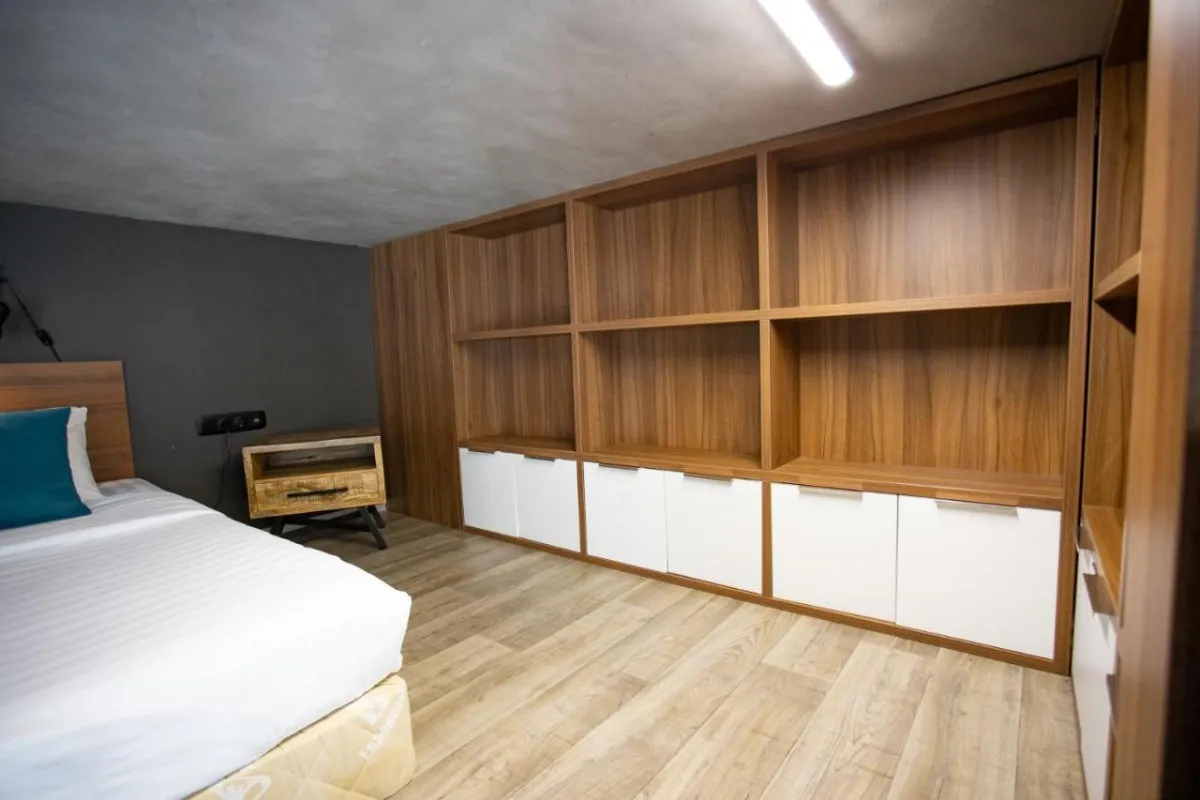 одна двуспальная кровать, кухня