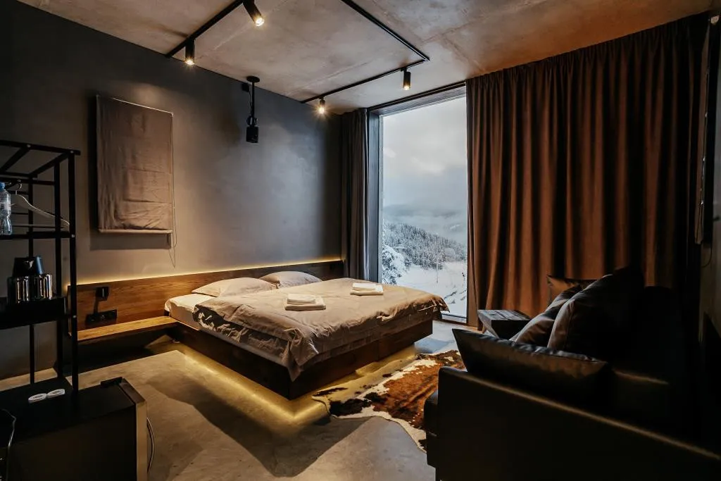 Гостям предлагаются номера с дизайнерским оформлением, панорамными окнами и комбинированным освещением. В номерах установлены проекторы.