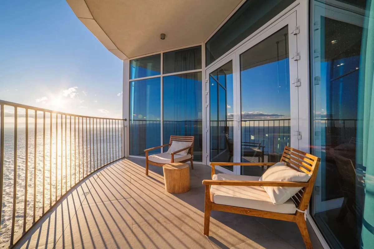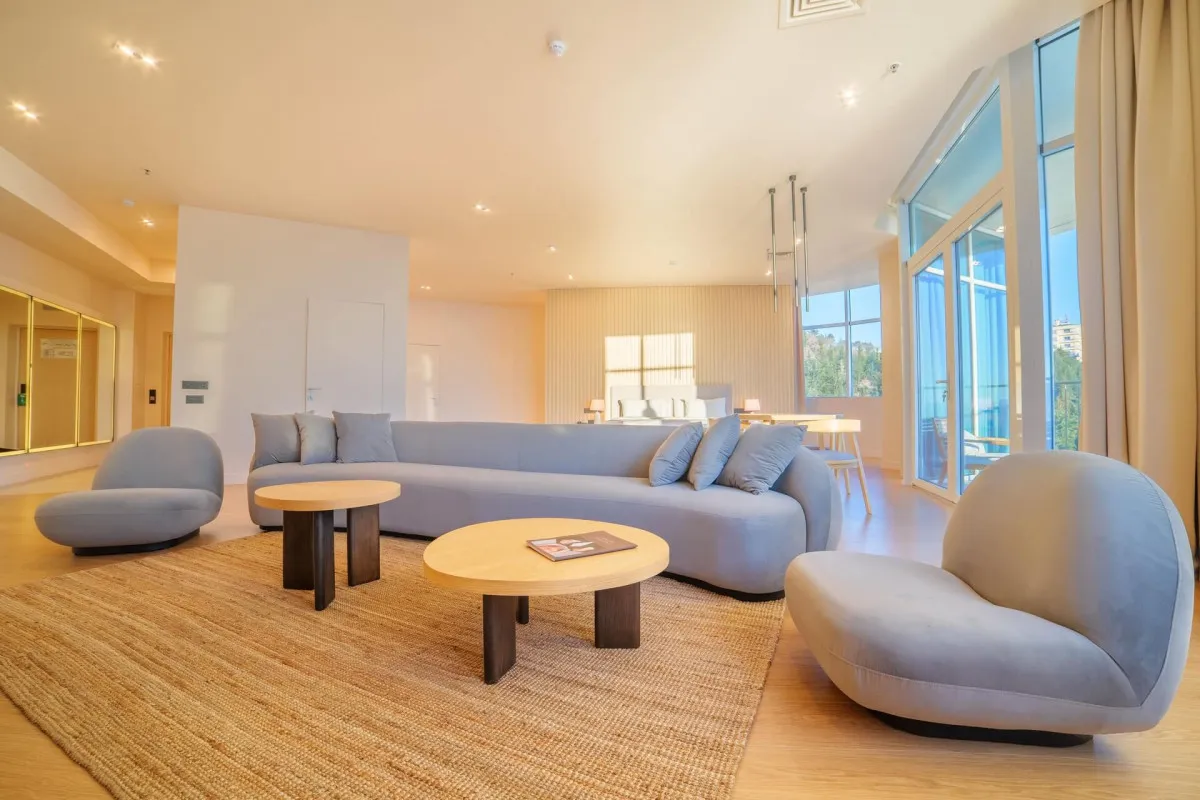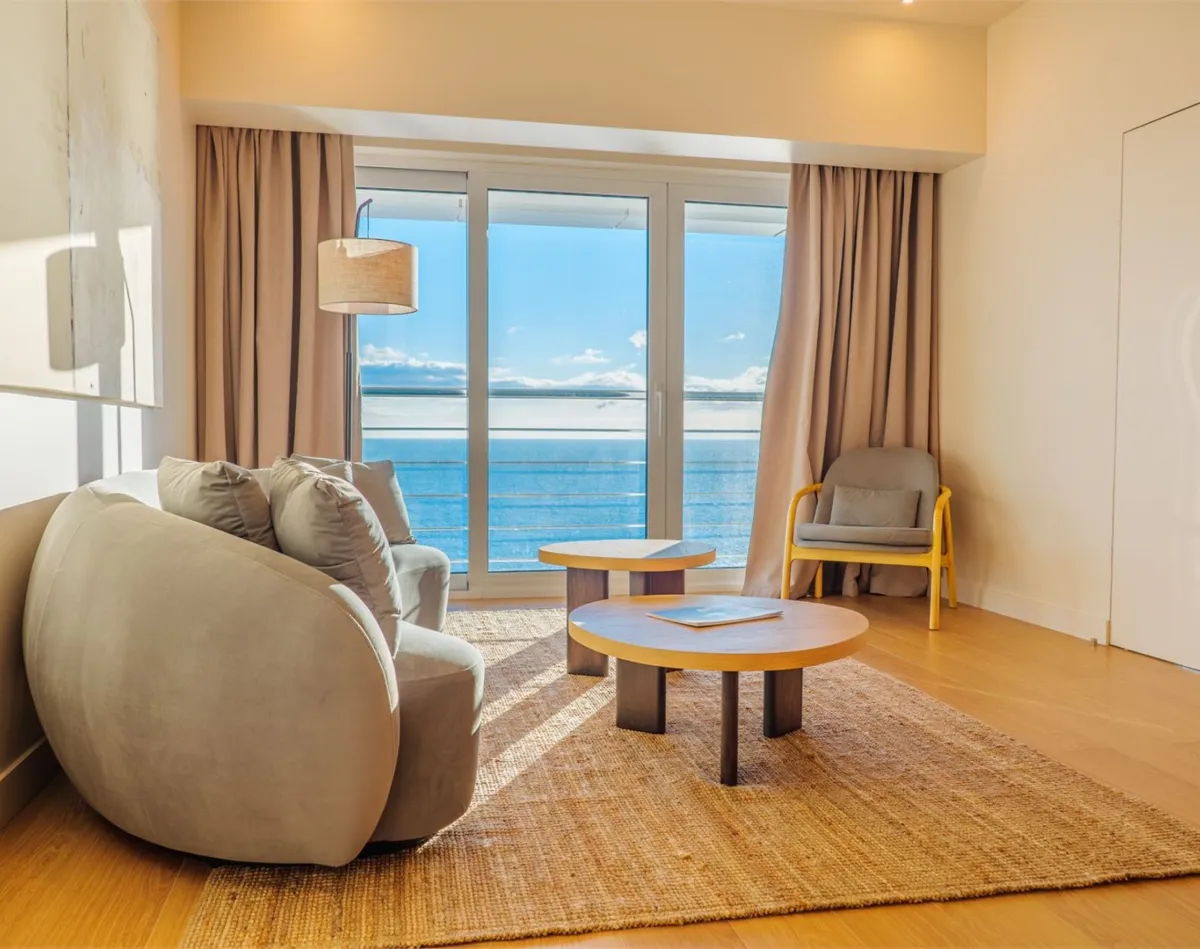 100 м2, трехкомнатный номер с обзорным видом на море, две спальни с двуспальными кроватями и гостиная с диваном и креслами