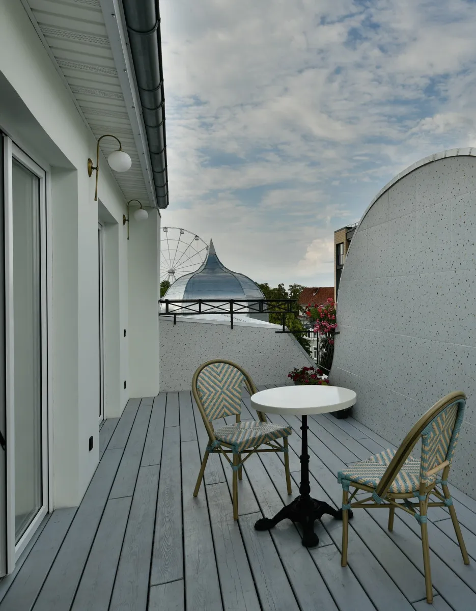 35 м2, спальня с двуспальной кроватью, гостиная с диваном, ванная комната с ванной, просторная терраса с видом на кирху Св. Альберта, старинную водонапорную башню и колесо обозрения. Количество гостей: максимум 2. Люкс создан в дань памяти основателя оте…