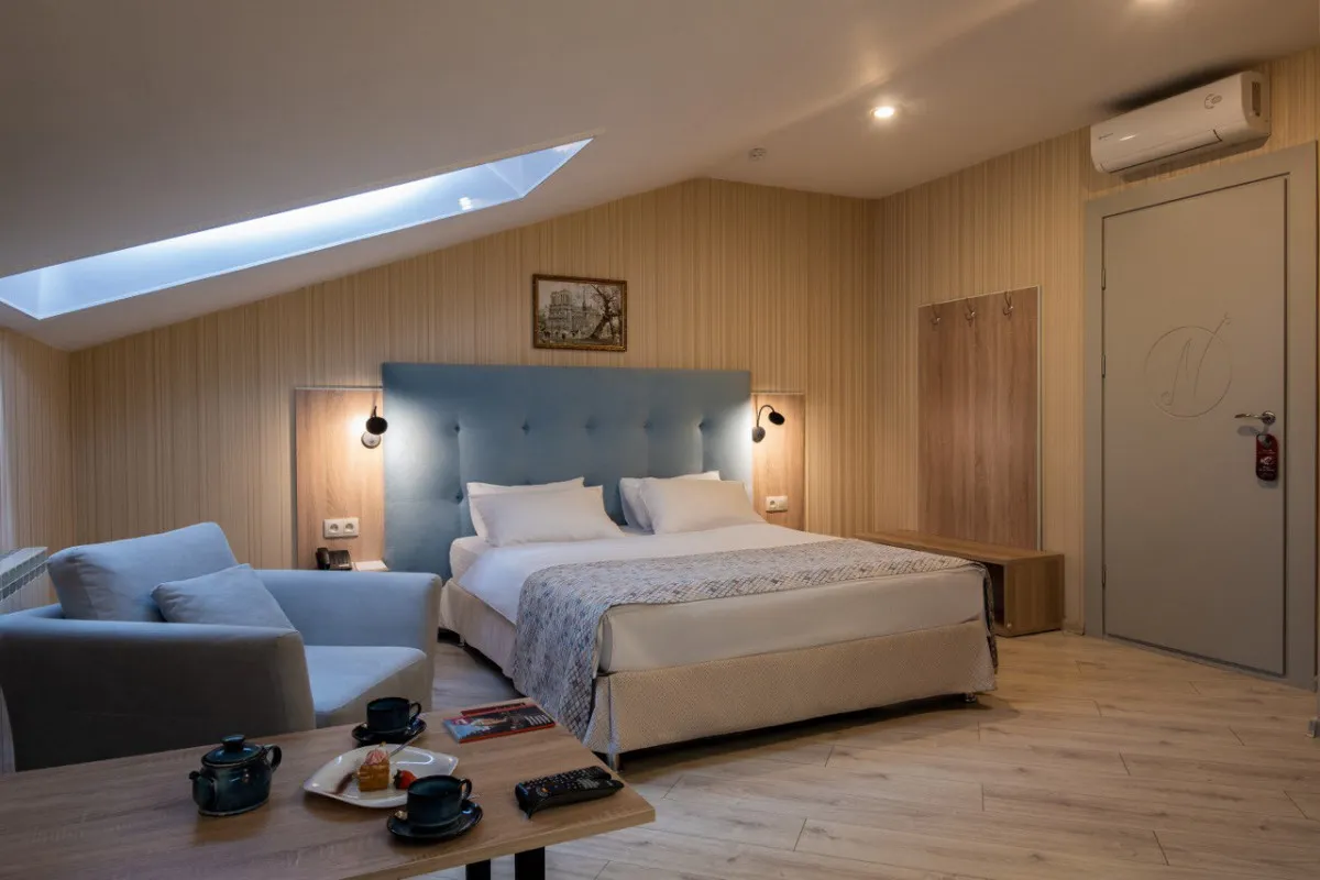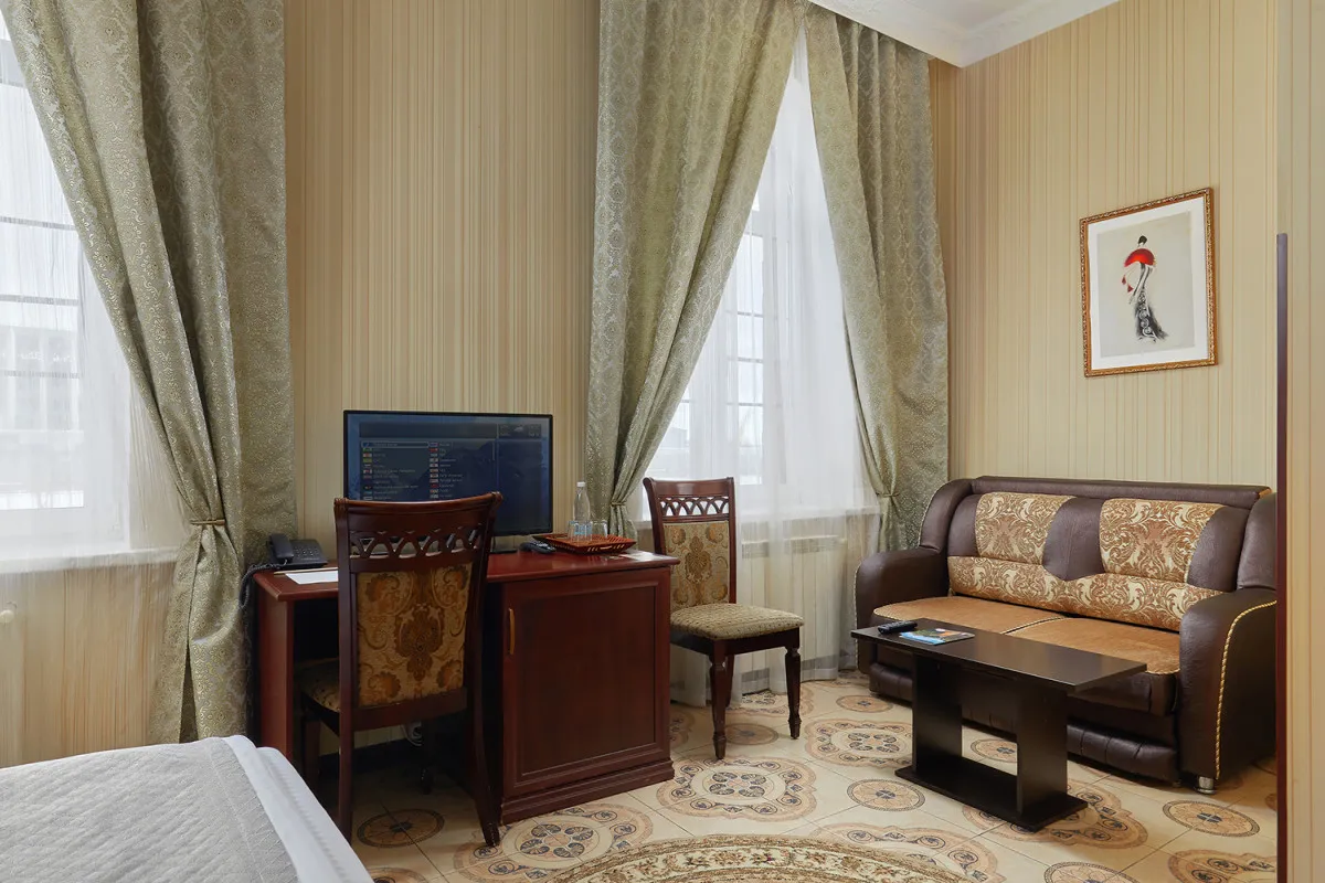 Здание, ныне занимаемое отелем, построено еще в XIX веке. В ходе реставрации был максимально выдержан первоначальный стиль строения – большие просторные номера, арочные окна, колонны, старинные предметы интерьера в ресторане и холле здания.