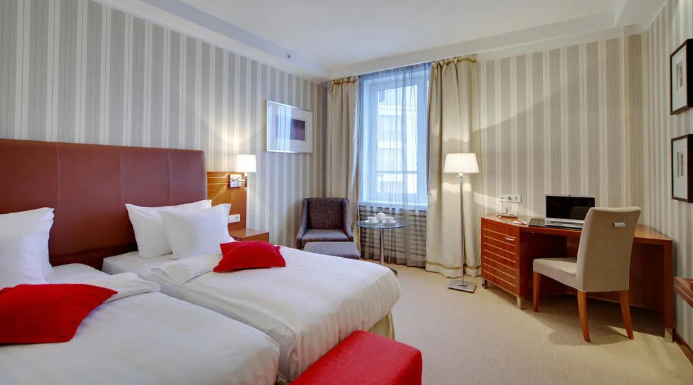 от 28 м2, две односпальные кровати, рабочее пространство. При необходимости в номере может быть установлена дополнительная кровать. Количество гостей: до 3