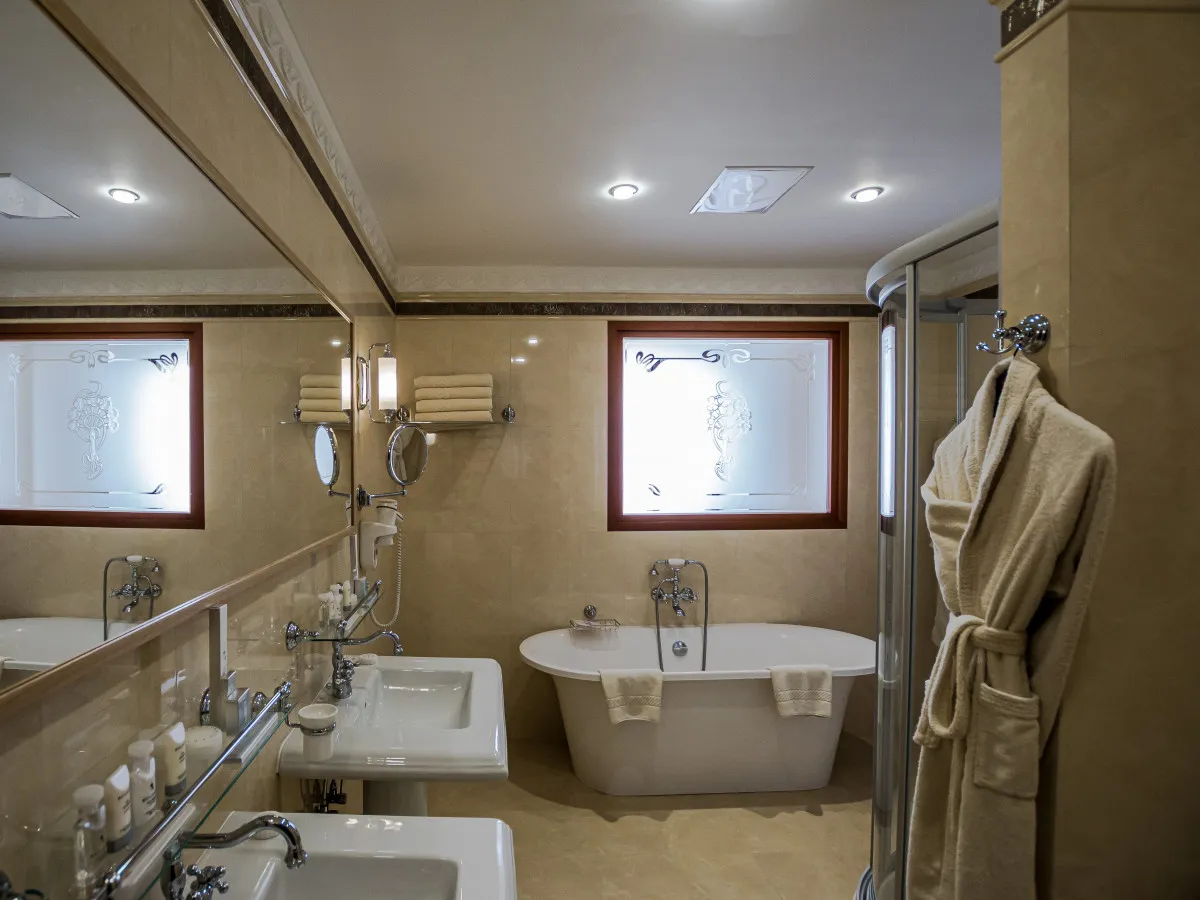60 м2, двуспальная кровать, гостиная с диваном, прихожая, ванная комната с ванной и душевой кабиной. Возможно совмещение с номерами других категорий.