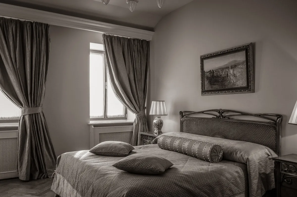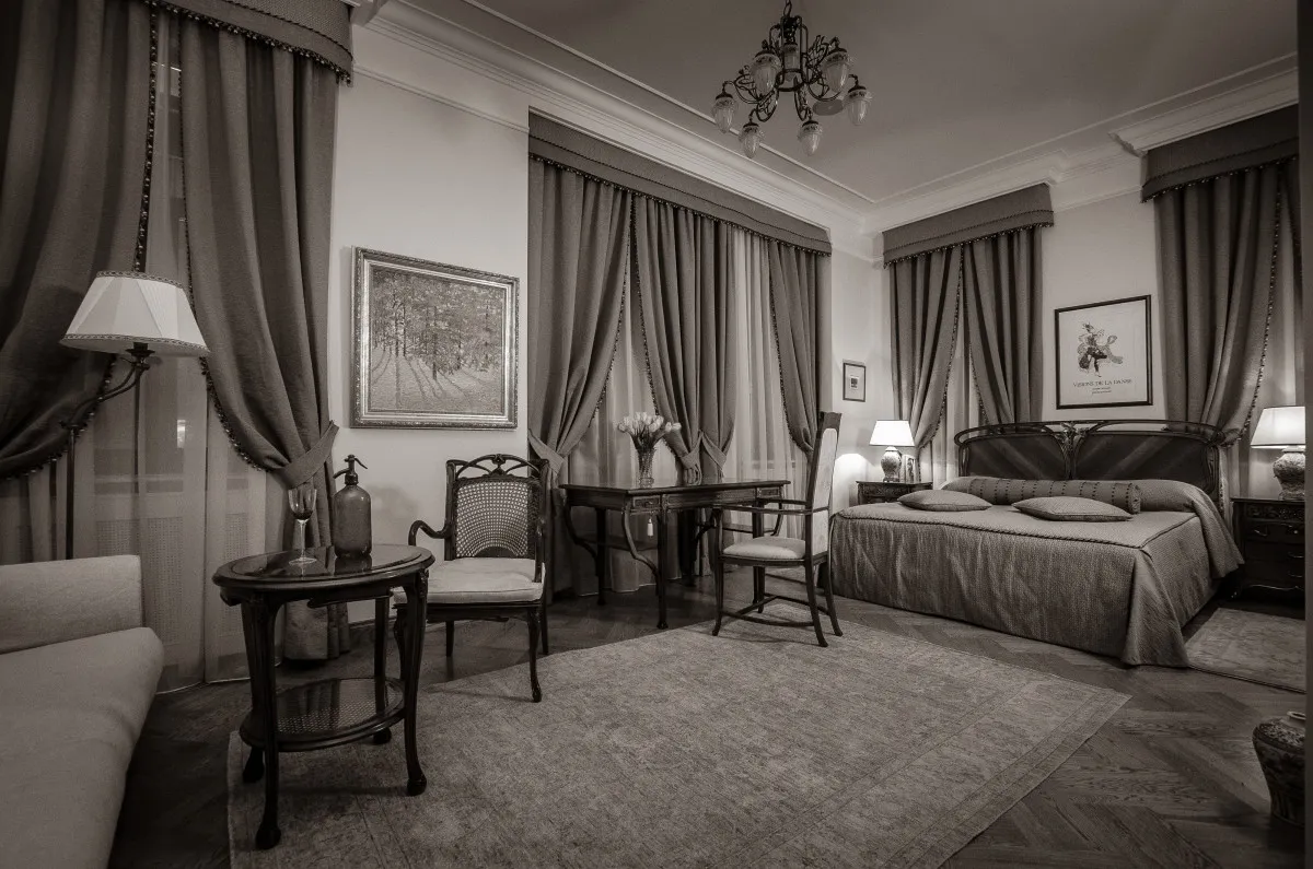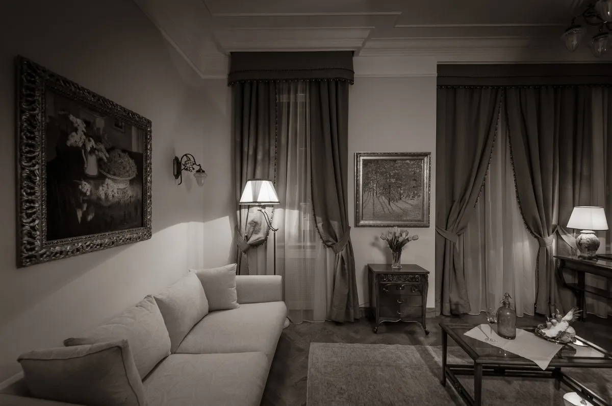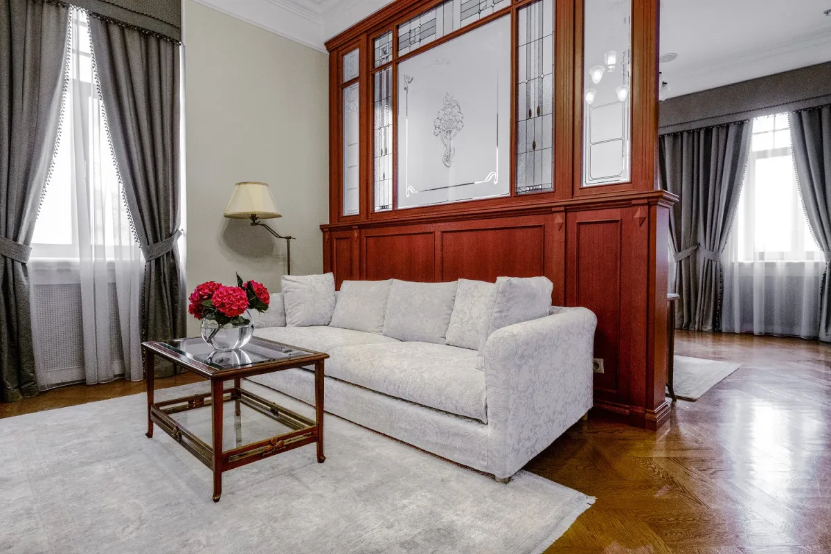 41 м2, вид на бульвар и внутренний двор, двуспальная кровать, гостиная с диваном, ванная комната с ванной и душевой кабиной.