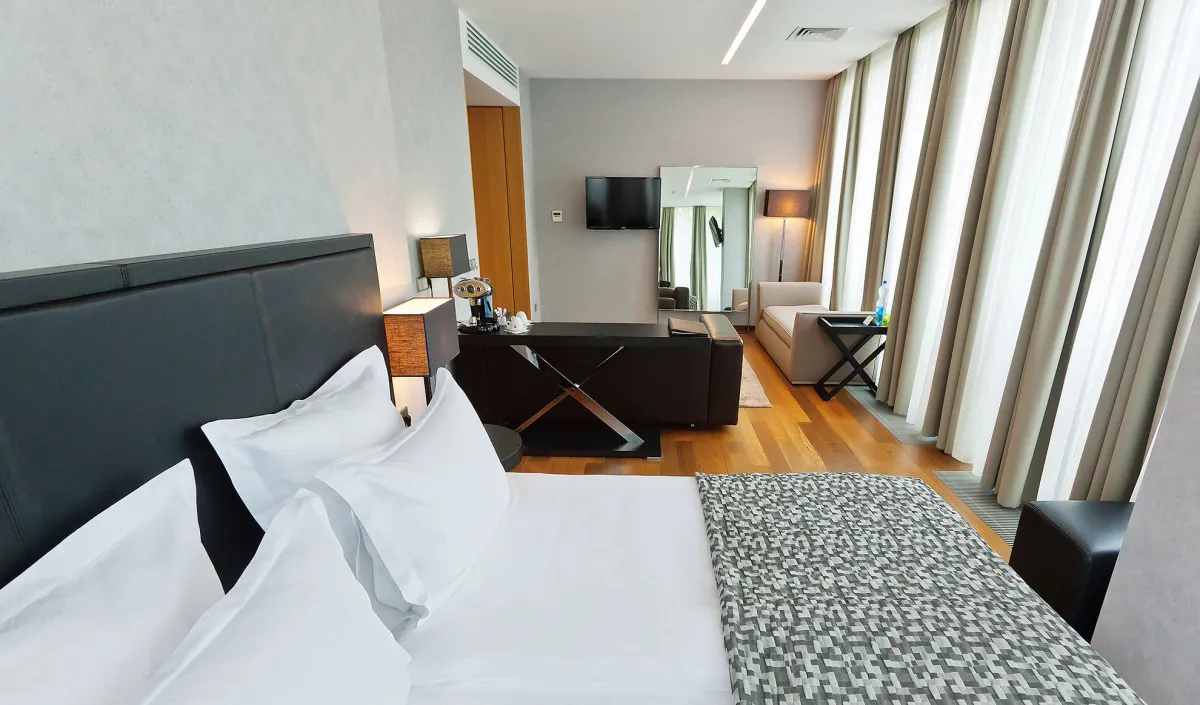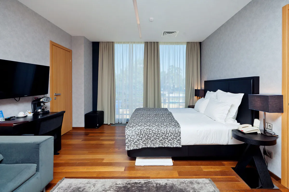 40 м2, вид на бассейн, внутренний двор отеля, парковую зону, двухкомнатный номер с раздвижными панорамными окнами, спальня оснащена одной кроватью размера king-size, в отдельной гостиной расположен диван-кровать. Количество гостей: до 4