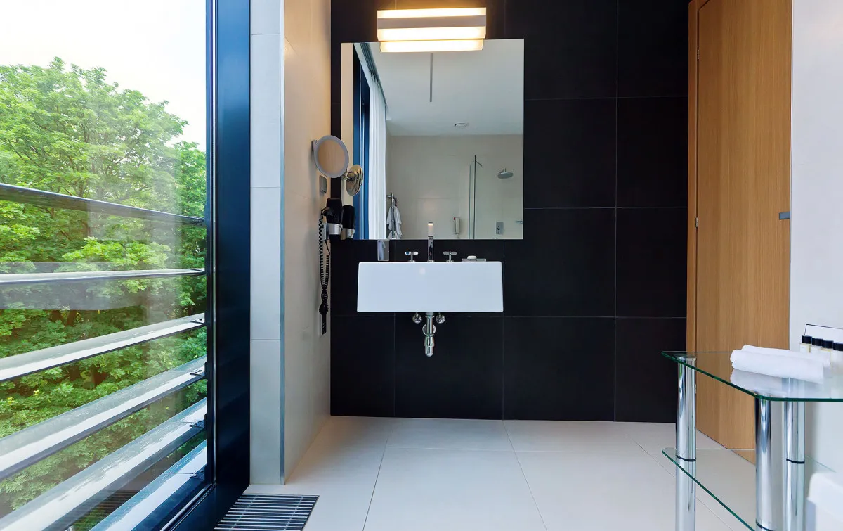 52 м2, панорамный вид на парковую зону, бассейн и внутренний двор, номер представлен в виде угловой стеклянной панорамы с раздвижными окнами, спальней с кроватью размера queen-size, холлом, туалетной комнатой с ванной и душевой кабиной. В выделенной гостиной зоне находятся софа и раскладывающийся диван. Количество гостей: до 4