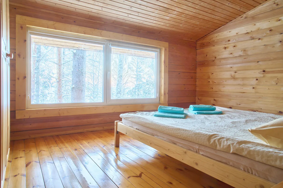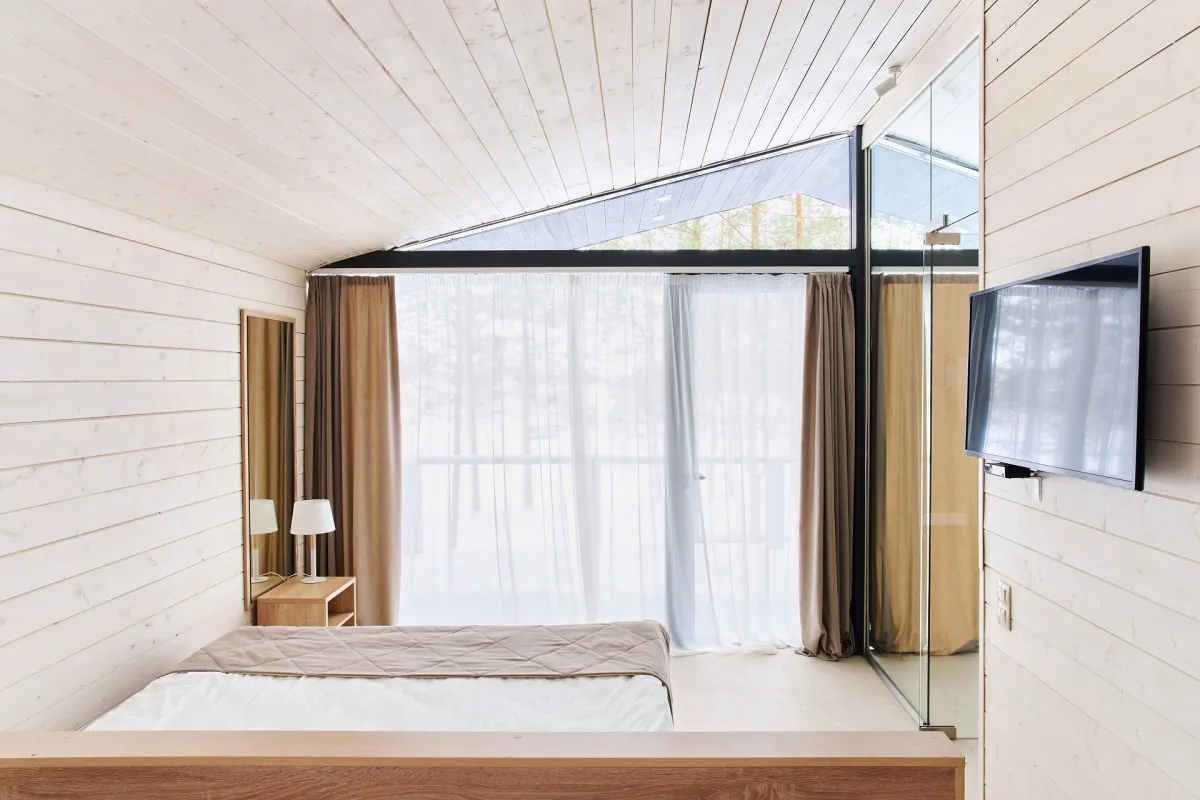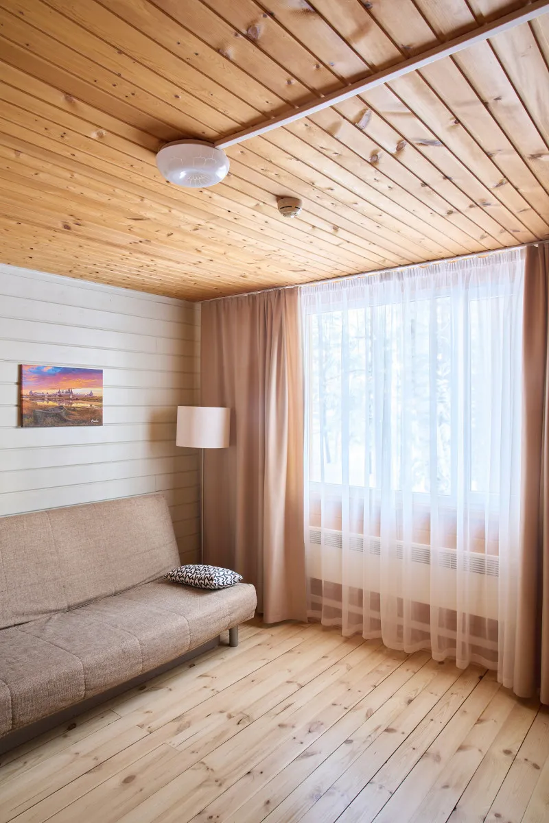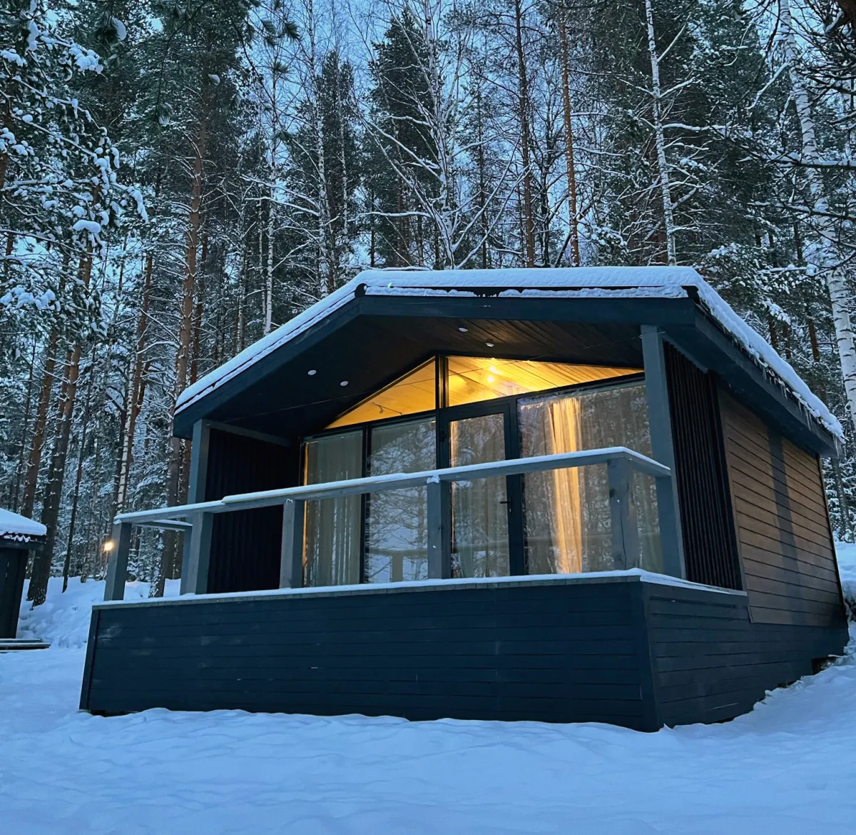 30 м2, открытая терраса, спальня (двуспальная кровать или две односпальные кровати), мини-кухня, ванная комната с панорамным окном и ванной. Расположен на самом берегу озера Сундозеро. Количество гостей: максимум 2