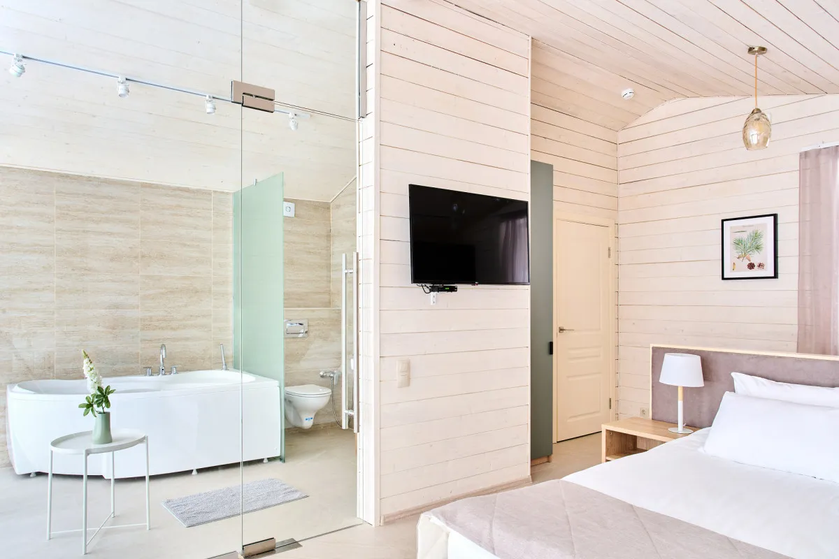 140 м2, сауна с панорамным окном и выходом на террасу, две спальни (две двуспальные кровати), гостиная с раскладным диваном, полностью оборудованная кухня с посудомоечной машиной, две ванные комнаты с душевой кабиной. Количество гостей: максимум 6
