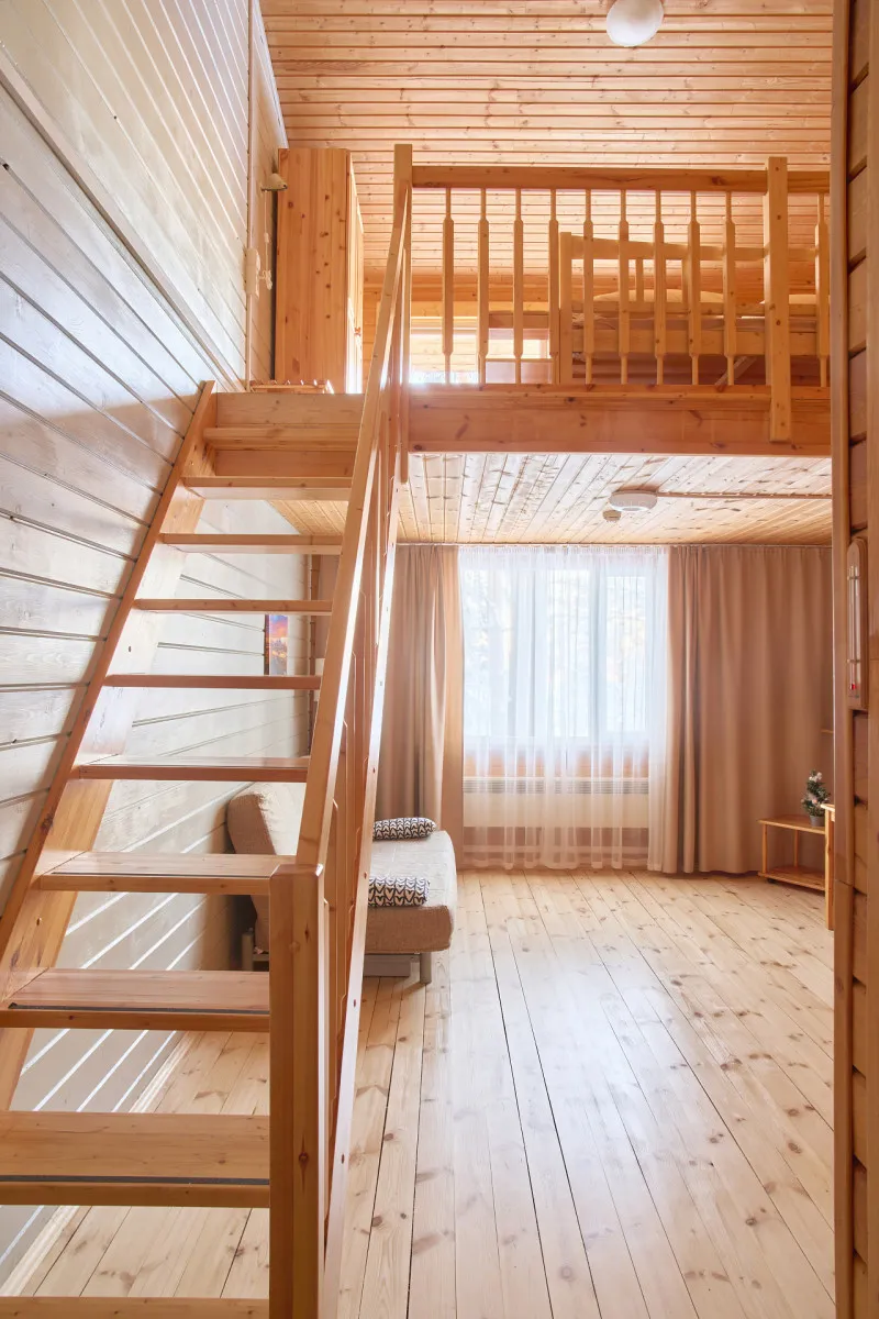 54 м2, 2-этажный коттедж: терраса, сауна на 1 этаже, две спальни (двуспальная кровать, две односпальные кровати), кухня, гостиная (диван-кровать), гардеробная. Количество гостей: максимум 6