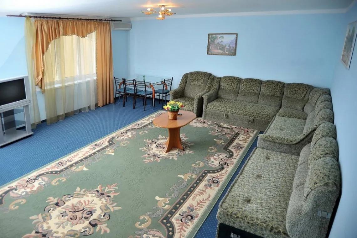 большой просторный номер, расположенный на двух уровнях, четыре спальни с двуспальными кроватями, гостиная с диваном и креслами, кухня с обеденным столом