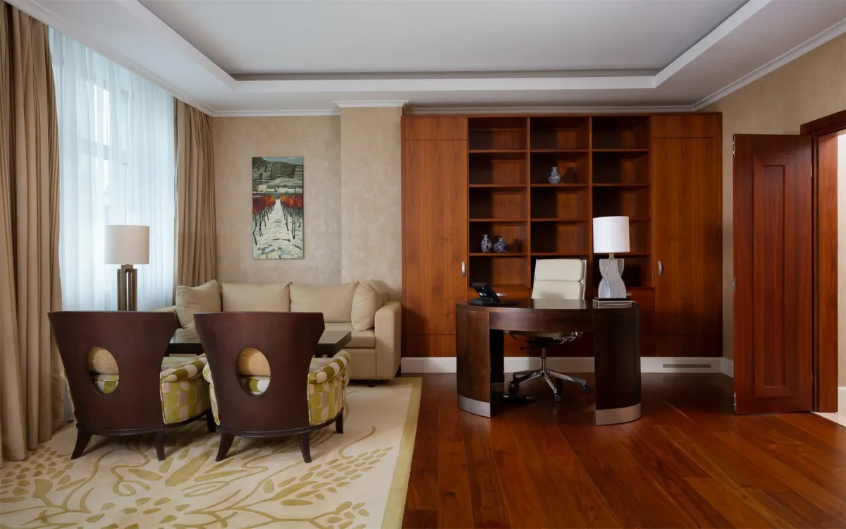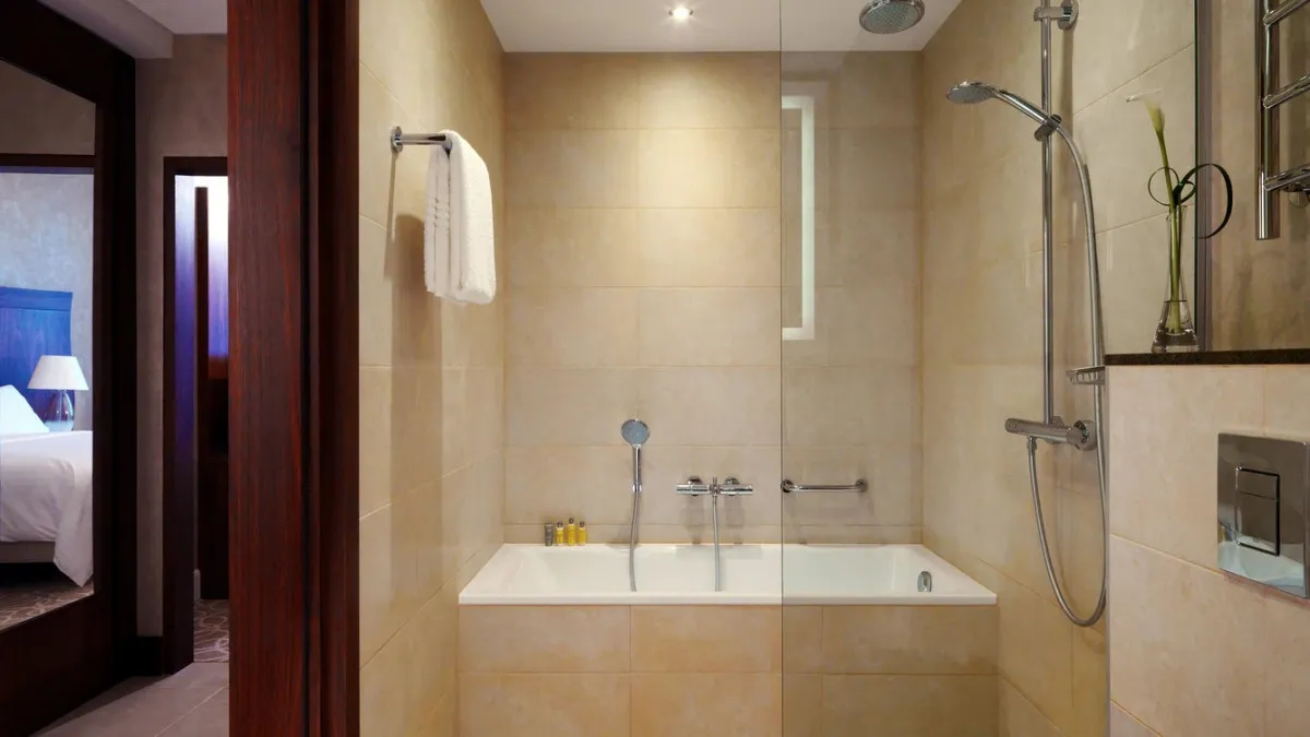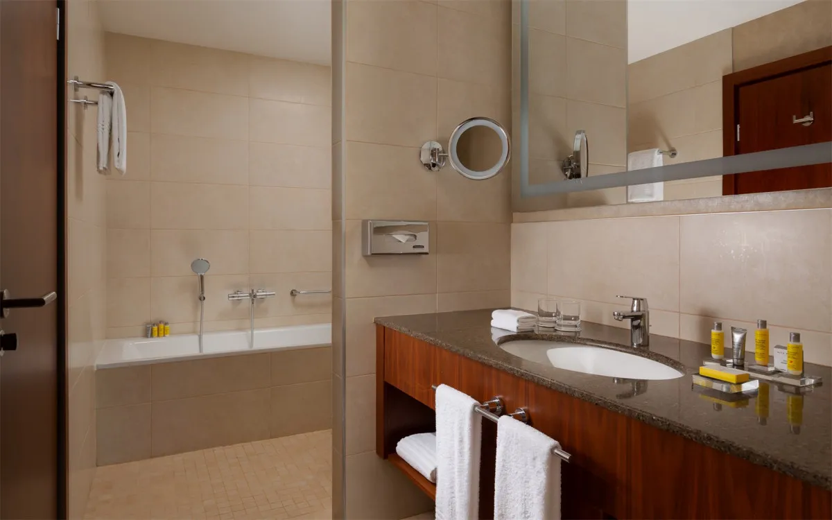 122,8 м2, премиальный апартамент с видом на город: спальня с двуспальной кроватью и полноценным рабочим местом, гардеробная и ванная комната с ванной, душевой кабиной и премиальной косметикой, кухня с барной стойкой, зона со стиральной машиной, гостевой туалет.
