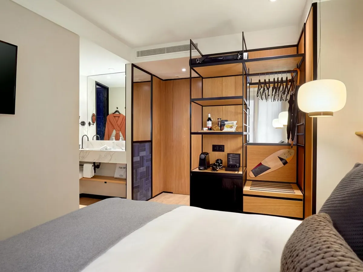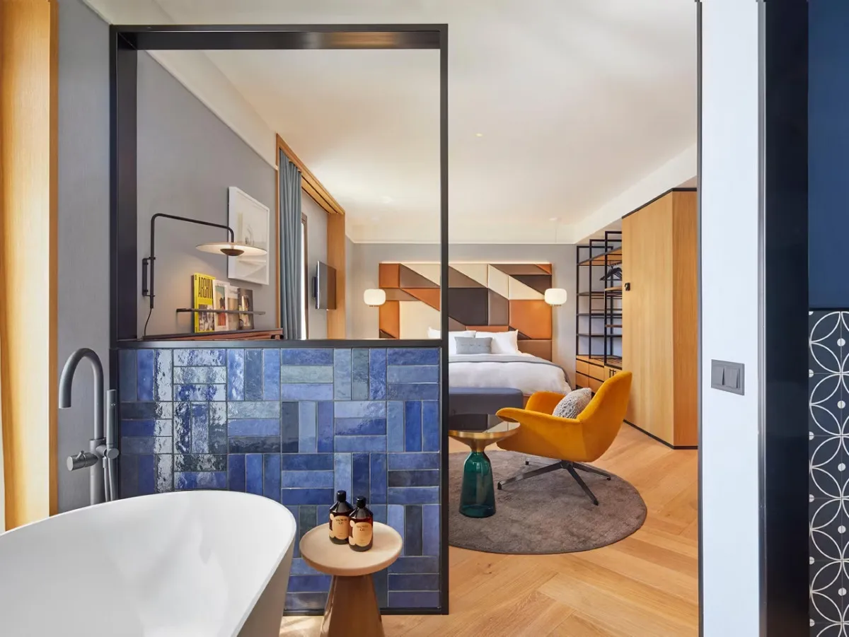 48 м2, люкс в стиле лофт: вид на улицу, спальня (большая двуспальная кровать) с открытой ванной, гостиная с диваном. Количество гостей: до 2