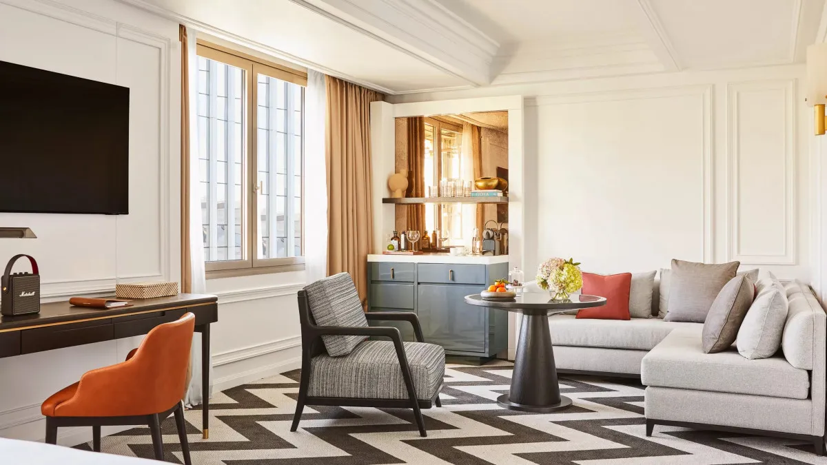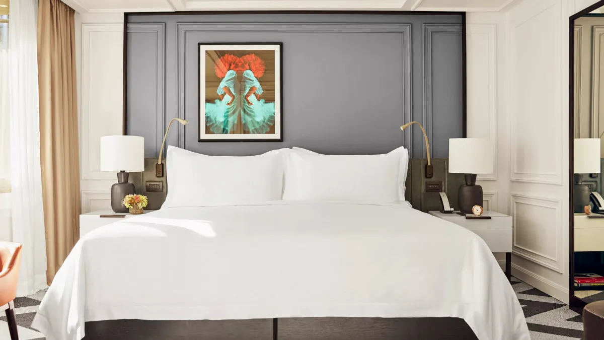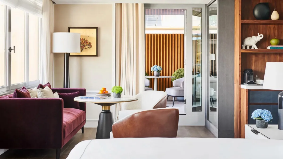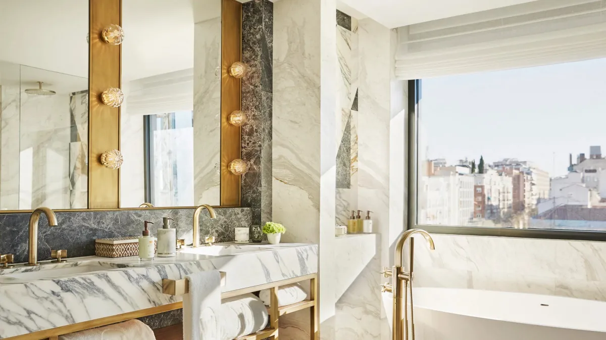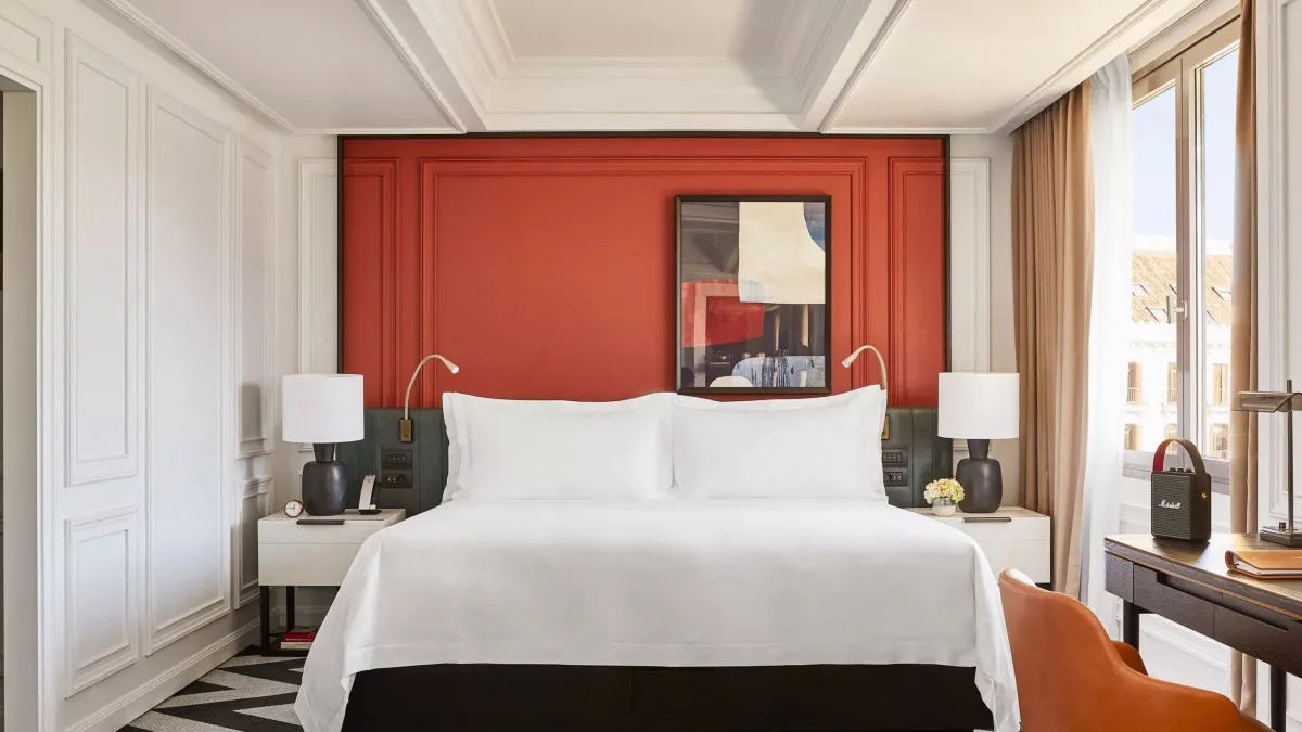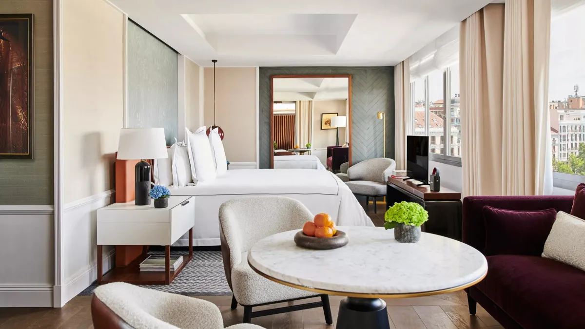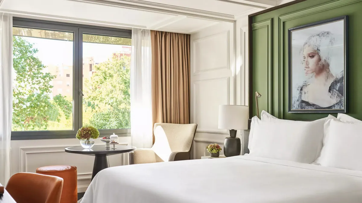 50 м2, вид на бульвар Castellana, 1 двуспальная кровать или 2 односпальные кровати + 1 раскладная кровать (по запросу), гостиная с рабочим столом и просторная гардеробная. Количество гостей: до 3