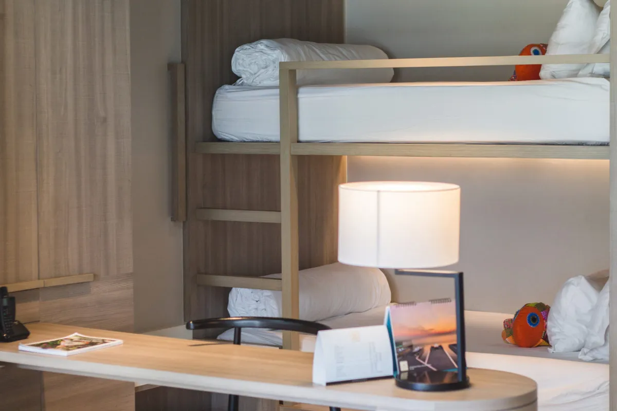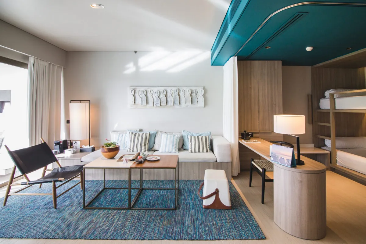 79 м2, главная спальня с кроватью размера king-size, отдельная гостиная с диваном-кроватью и двухъярусной кроватью, частный балкон с бассейном