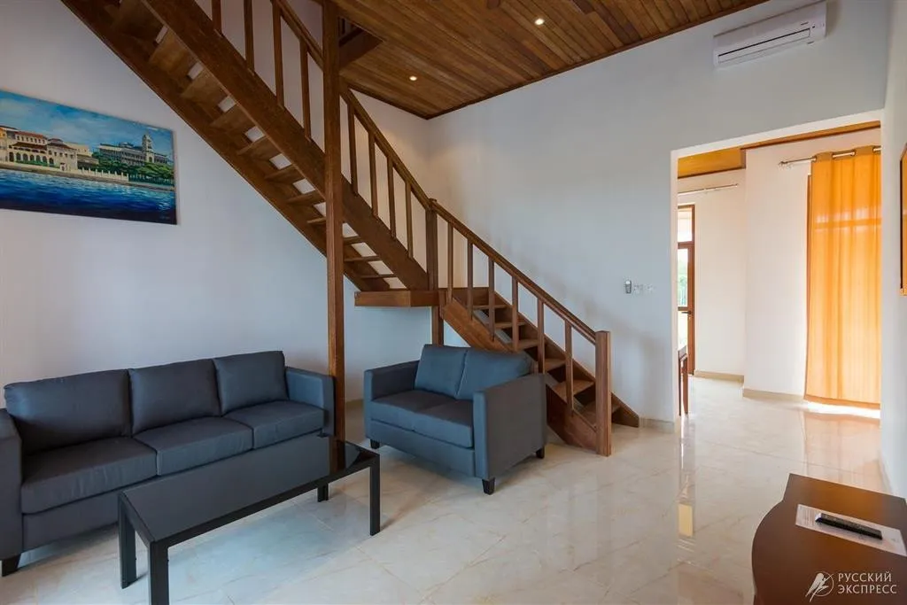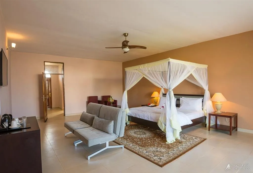 кондиционер, антимоскитная сетка, гостиная зона, телевизор с плоским экраном и спутниковыми каналами, а также собственная ванная комната с душем. В некоторых номерах есть балкон с видом на море.