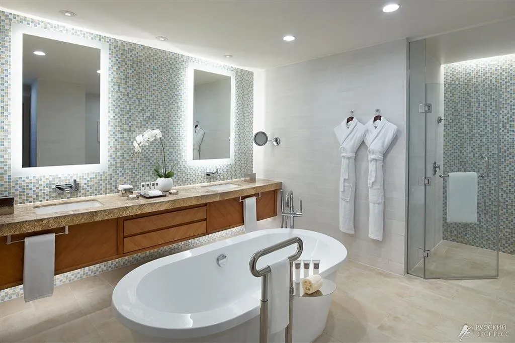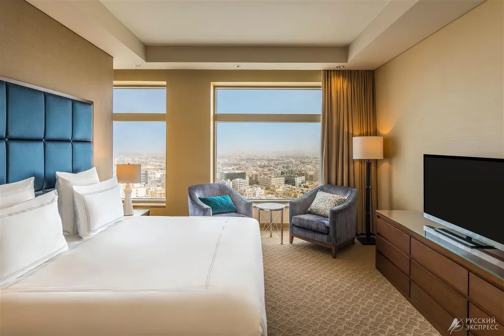 111 м2, просторный люкс с видом на город и Персидский залив. Спальня с кроватью king-size, просторная гостиная с обеденной зоной, ванная комната, гостевой санузел. Привилегии для гостей люкса: однократный депозит в размере 300 AED на еду и напитки, возможность позднего выезда. Максимальное количество гостей: 5.