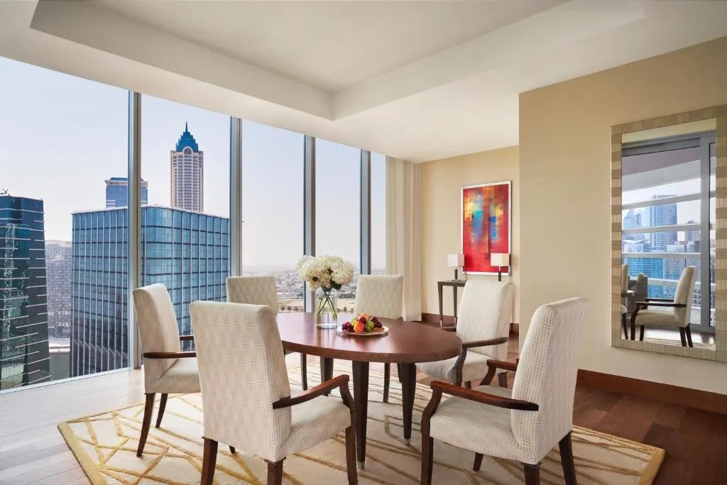235 м2, вид на Дубай и небоскреб Бурдж-Халифа, двуспальная кровать, гостиная с обеденной зоной, балкон с бассейном. Количество гостей: 2 взрослых + 1 ребенок