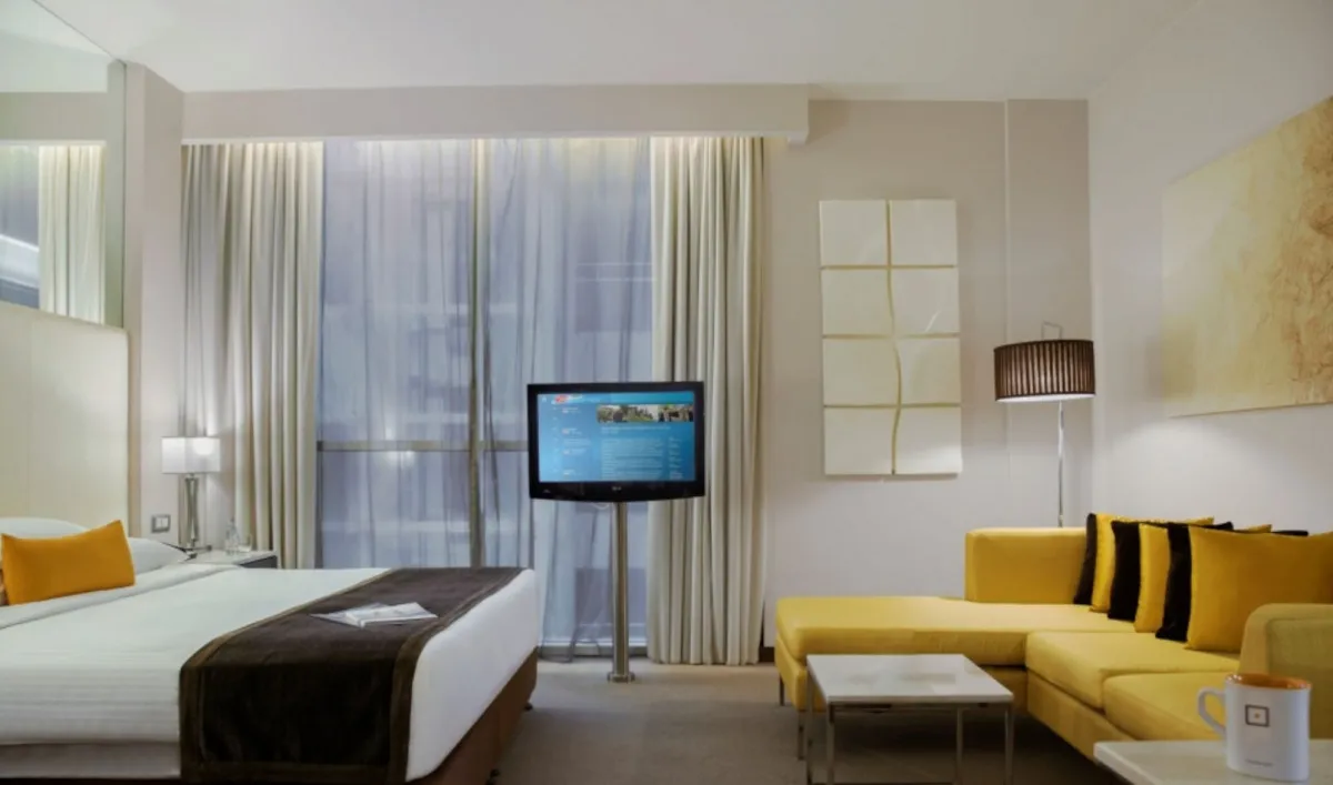 44 м2, с видом на город, двуспальная кровать размера queen-size, диван, гостиная, количество гостей: 2 взрослых + 1 ребенок