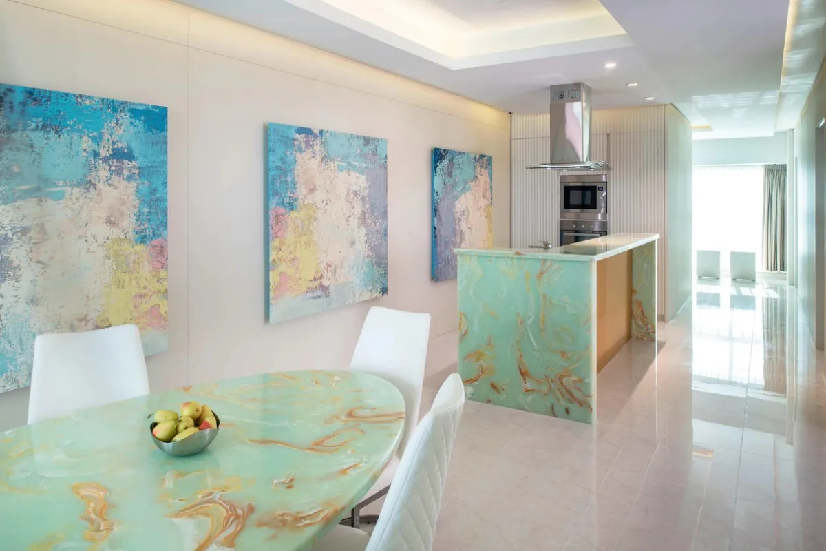 140 м2, вице-президентский угловой люкс с видом на лагуну и город, одной спальней, одной кроватью king-size, отдельной гостиной, балконом. Максимальное количество гостей: 3.