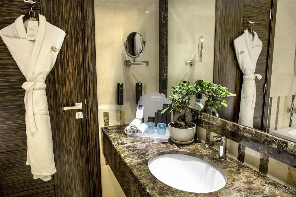 Отель Jannah Burj Al Sarab 5* предлагает роскошный отдых для семей и широкие возможности для бизнес-поездок. С крыши современного 18-этажного здания открывается панорамный вид на Абу-Даби и Персидский залив. Бассейн и фитнес-центр отеля расположены на верхнем этаже, чтобы гости могли наслаждаться городскими пейзажами. Jannah в переводе с арабского означает «рай» или «сад». Сотрудники отеля видят свою миссию в том, чтобы воплощать роскошь, спокойствие и безопасность «сада».