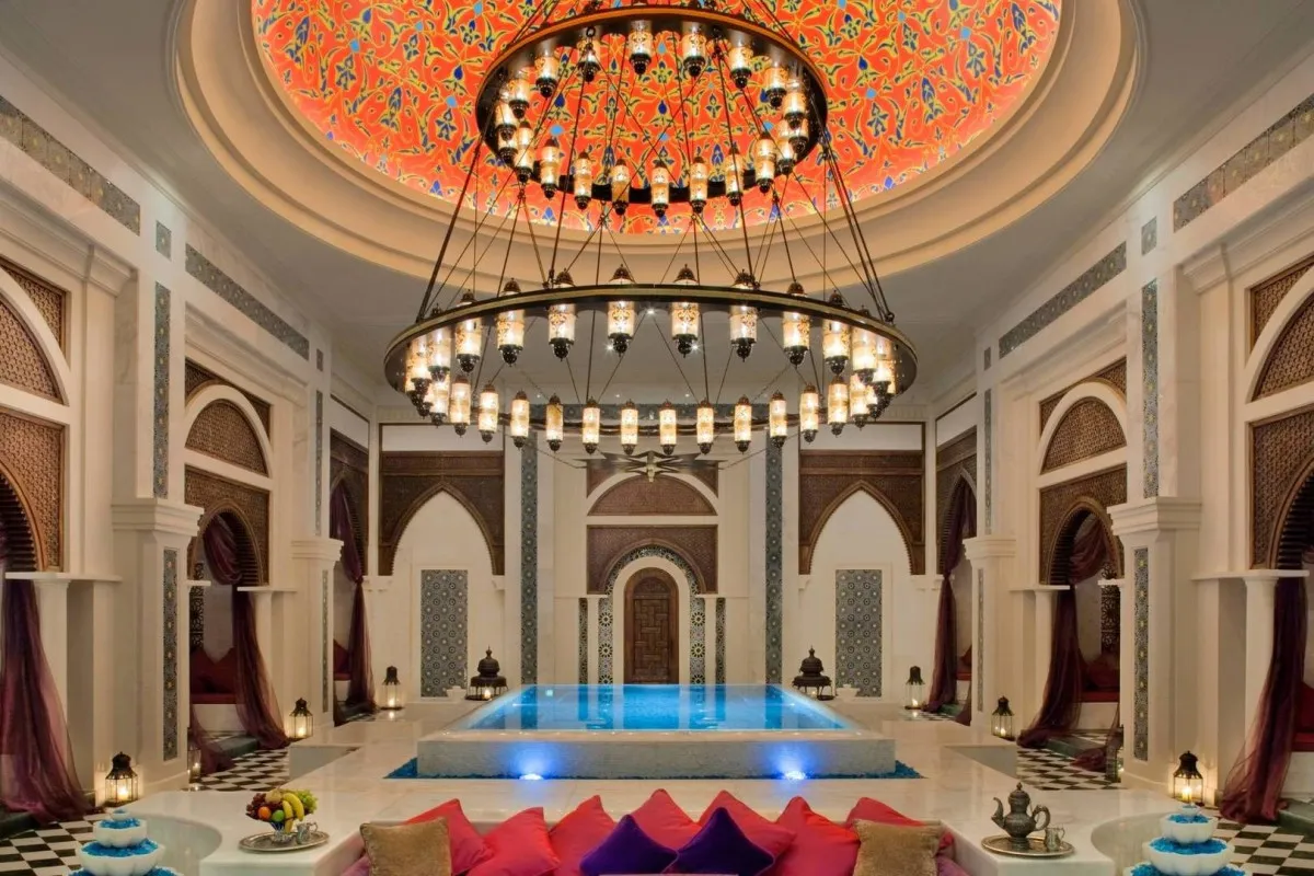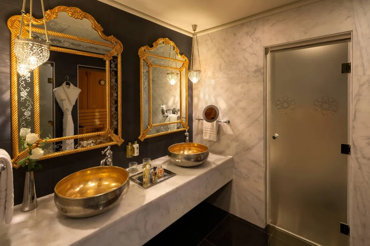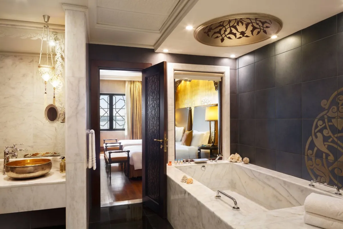 Дизайн отеля вдохновлен величественными дворцами Османской империи. Интерьеры поражают изысканной роскошью: великолепные расписные потолки, настенные фрески ручной работы, изящная резьба по мрамору, роскошные хрустальные канделябры и произведения искусства музейного уровня.