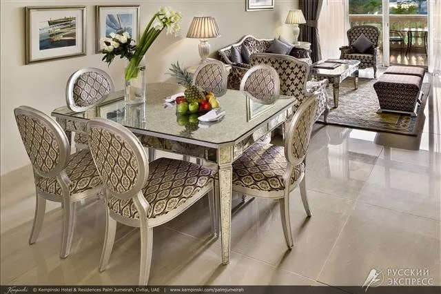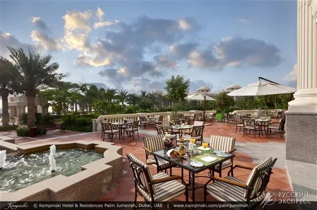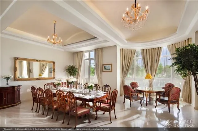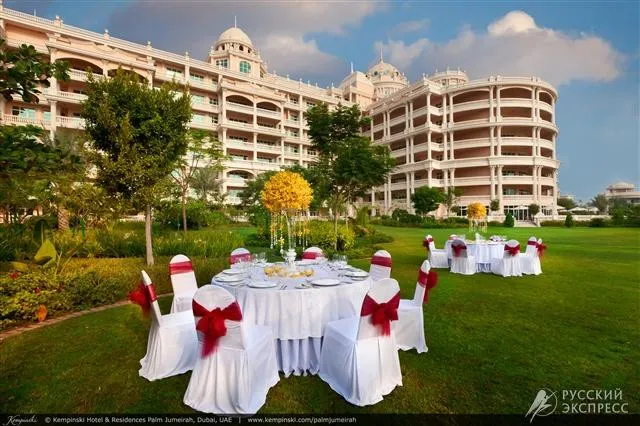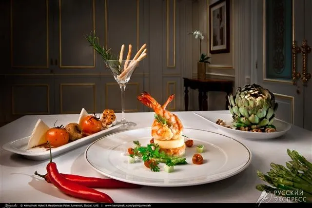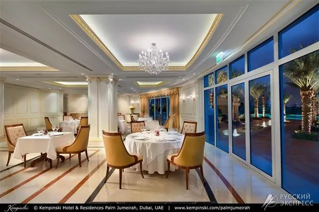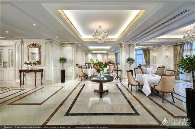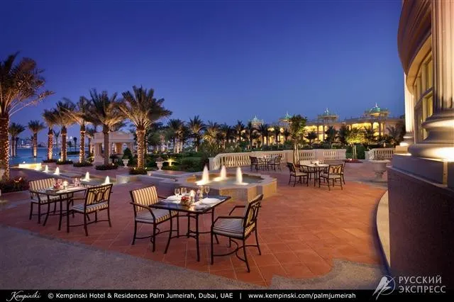 Местные шеф-повара создали премиальное меню из гурманских блюд. Отель Kempinski Hotel & Residence Palm Jumeirah 5* предлагает организацию романтического ужина на берегу или пышной свадьбы. Доступно проведение деловых мероприятий: в конференц-залах и на открытом воздухе.