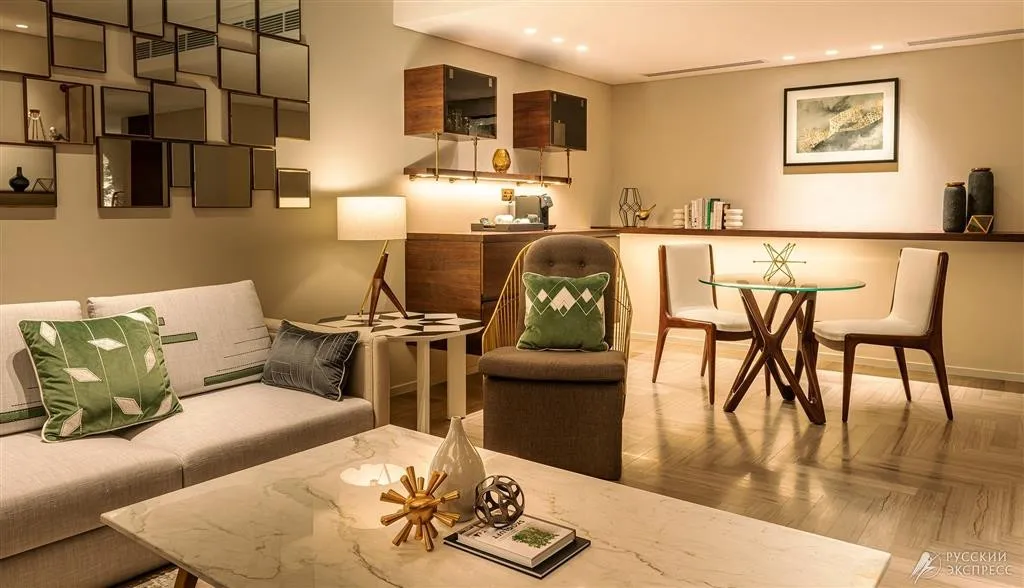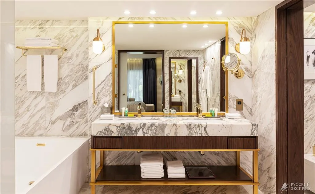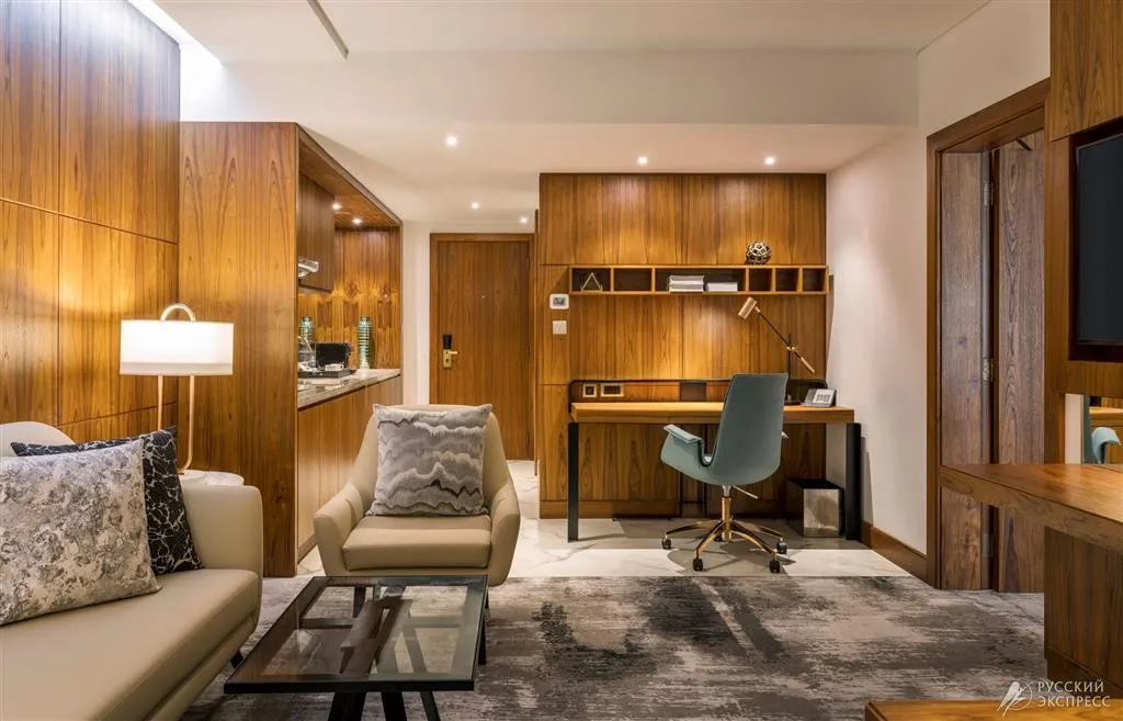 76 м2, элегантный люкс с кроватью king-size и роскошной ванной комнатой. В номере есть отдельная гостиная, рабочий стол, обеденная зона и гардеробная. Гости номера имеют привилегированный доступ в представительский лаундж. Максимальное количество гостей: 2.