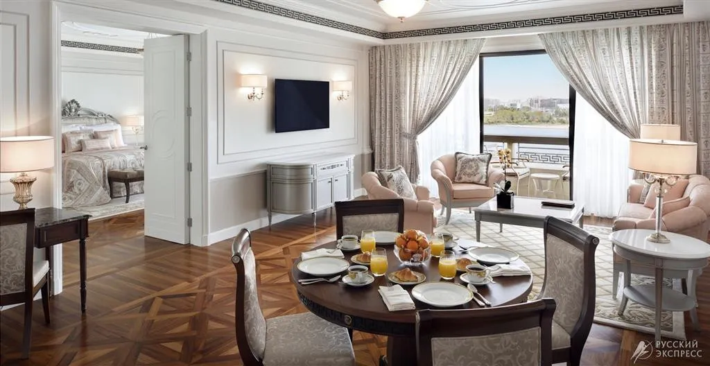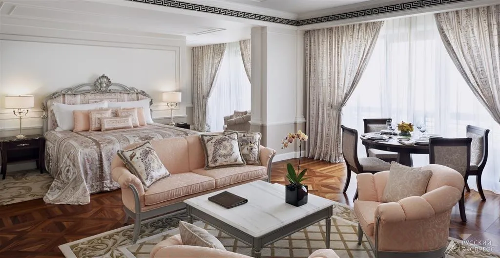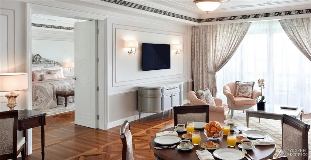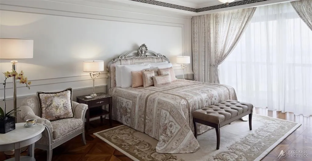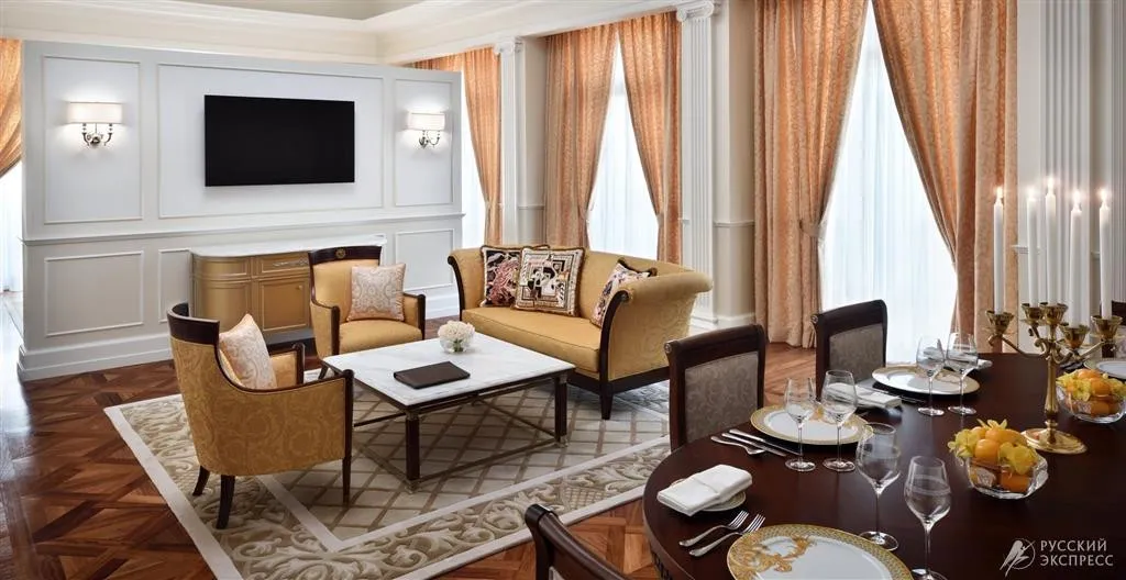 95 м2, с балконом и видом на город. Роскошный итальянский дизайн и мебель от Versace. В номере: king-size кровать, гардеробная, туалетный столик, обеденная зона, телевизор, мраморная ванная комната, рабочая зона, рабочий стол с панелью подключения мультимедиа, автоматизированная панель управления помещением.