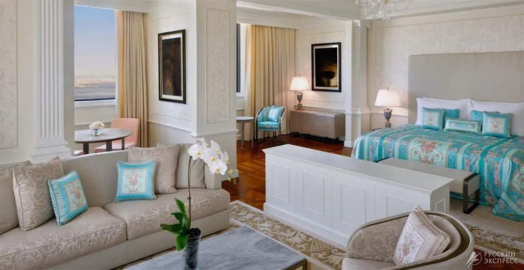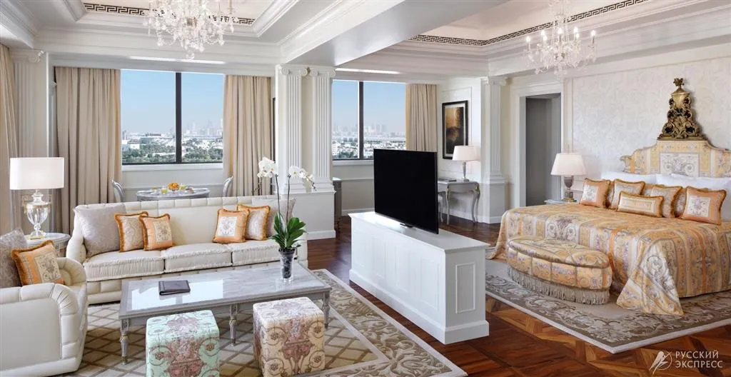 110 м2, с балконом и видом на Dubai Creek. Роскошный итальянский дизайн и мебель от Versace. В номере: king-size кровать, гардеробная, туалетный столик, гостиная, телевизор, мраморная ванная комната, рабочий стол с панелью подключения мультимедиа, автоматизированная панель управления помещением.