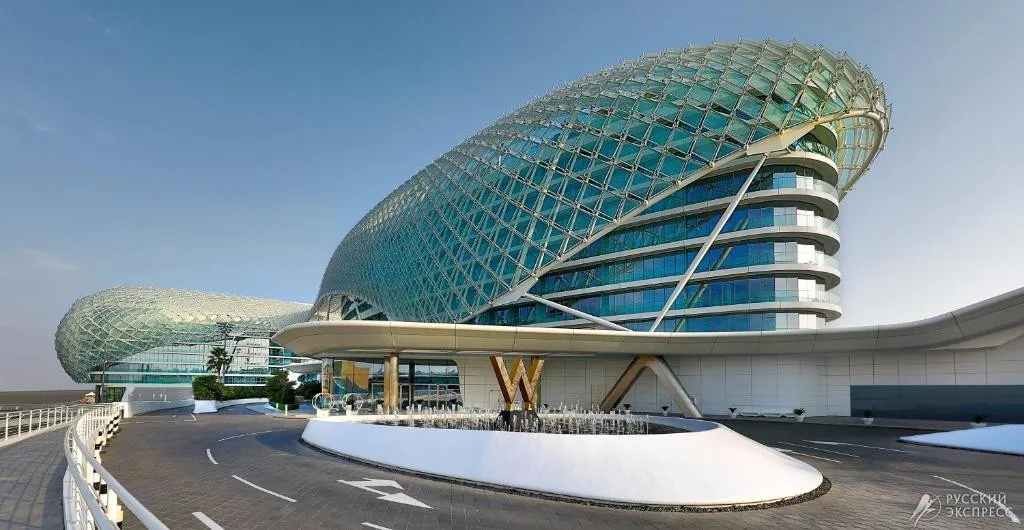 Здание W Abu Dhabi Yas Island 5* само по себе является объектом притяжения туристов. Спроектированное нью-йоркской компанией Asymptote Architecture, оно состоит из двух 9-этажных корпусов, один из которых находится на гоночной трассе, а другой нависает над искусственной бухтой. Над конструкцией расположено перекрытие – Grid Shell, оснащенное 5389 светодиодными элементами. Этот дизайн получил награды на нескольких международных выставках.